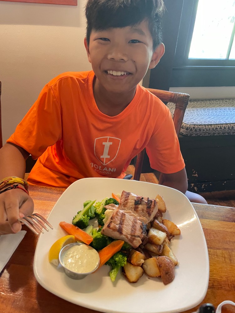 For some reason Paxton always seems to order something fancy. Just wait until you start paying the bills, kid. Grilled Ahi and a hot chocolate. Hot chocolate for all the kids! (and Kimi) lol