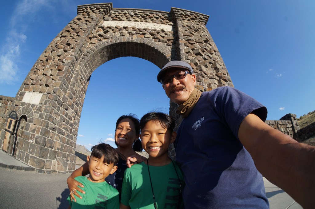 Task completed. Bozeman is located north of the park and so on our way back, we came through a small town named Gardiner. It was smaller than West Yellowstone. Really friendly looking. We stopped at the Roosevelt Arch.