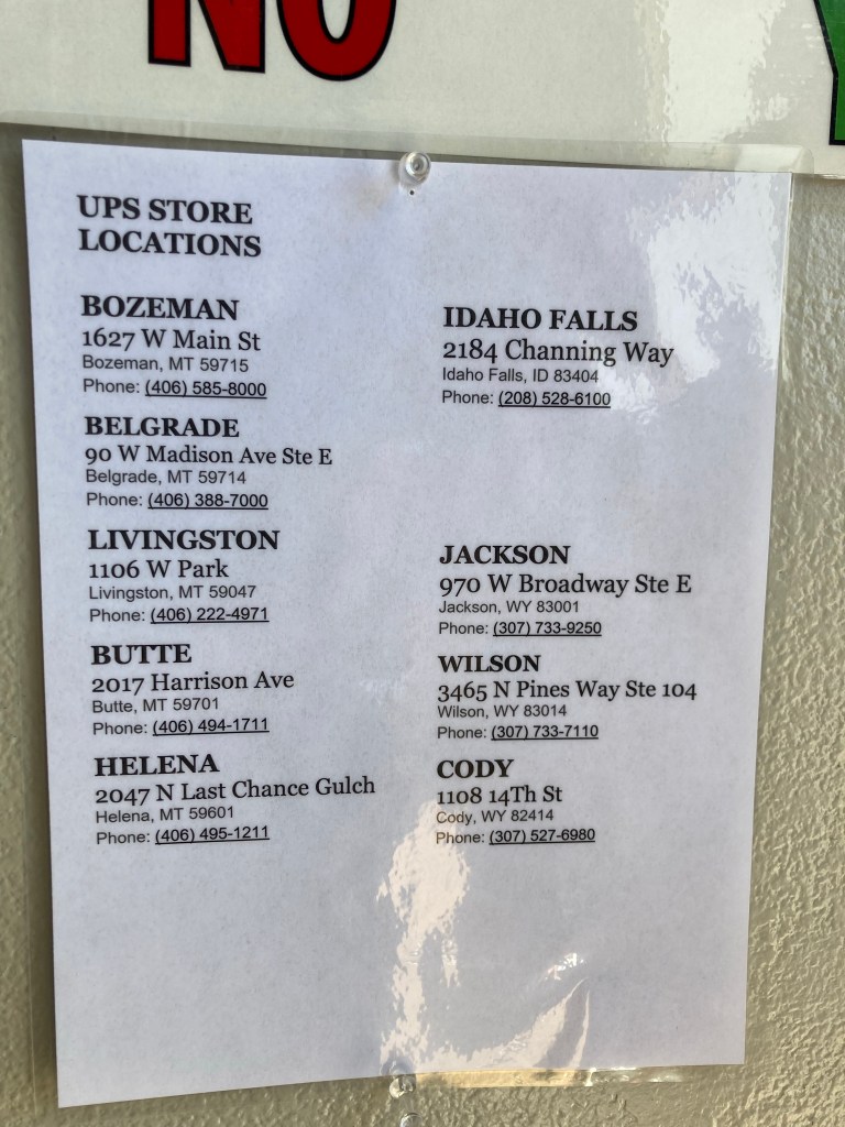 So it’s a good thing today was kind of an open day. Got laundry done. The main thing we wanted to do was to locally mail off the Covid tests that we purchased and brought from Hawaii at the UPS drop point for next-day air to meet our Covid test requirement to get back home. Problem was that they didn’t have next-day air at that West Yellowstone location for that day, Monday. That meant we had to either go up to Bozeman or down to Idaho Falls to an actual UPS store to make our deadline so that the kids wouldn’t have to quarantine for 10 days after flying back. Both were between an hour and a half to two hours away. We opted for Bozeman up north but not for any good reason. Here we dropped off our tests and looked for food.