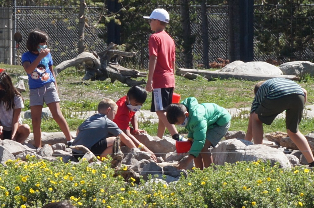 The kids are setting up food for a group of three bears: Condi, Seeley, and Bo. The idea is for the kids to hide food by burying it under rocks to simulate them foraging in the wild.