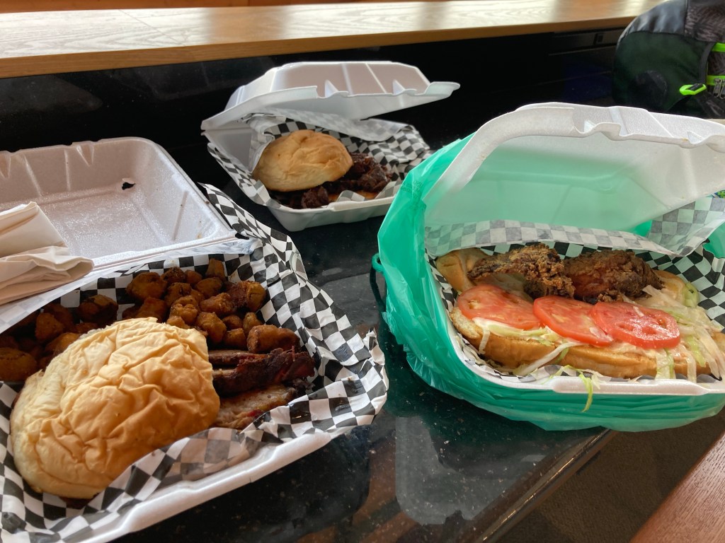 For our “warm” travel meal, we got lunch from BBQ 3. Brisket sandwich, burnt ends sandwich, catfish hoagie. Sides of mac and cheese x2 and fried okra. The boys loved the burnt ends, and I couldn’t believe the catfish stayed crunchy in the box. It reminded me of the McDLT sandwich McDonald’s had way back when for a short time.