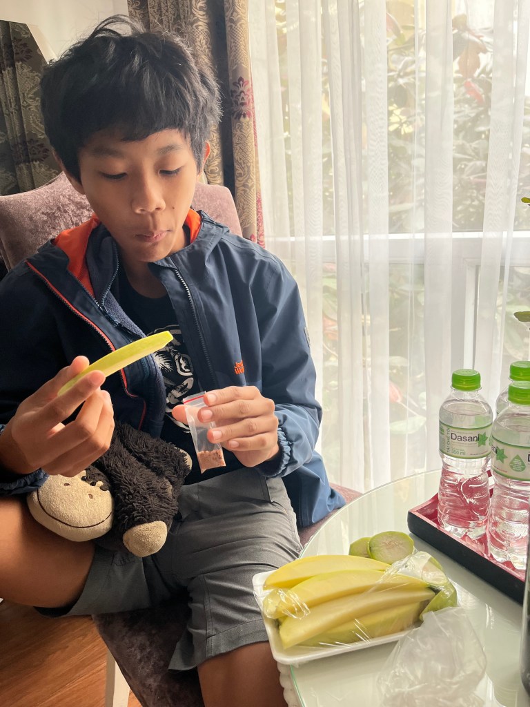 The bahn mi is what you’d expect, pork and pate and pickled vegetables and the fruit he picked were green mango and another small green fruit. There was a little li hing like salt that went with them.