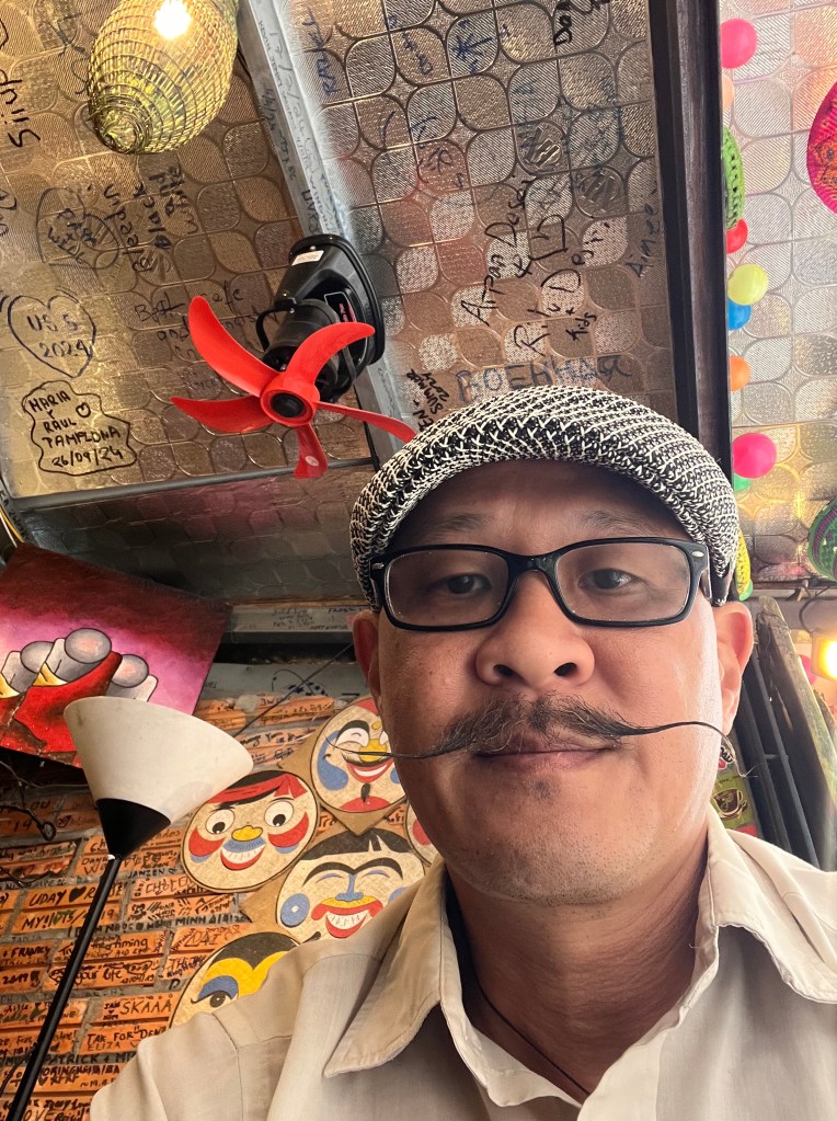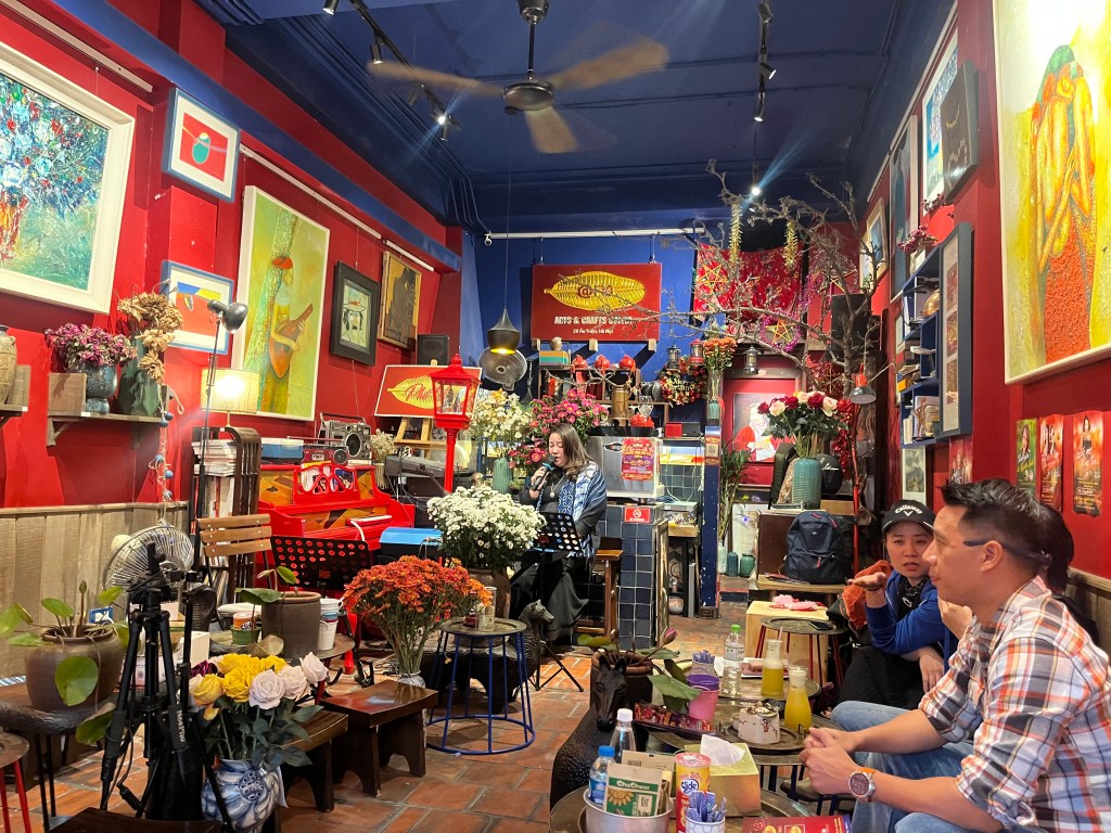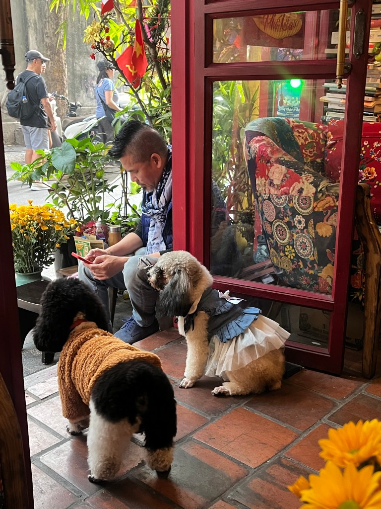 Nearby our hotel we spent some time hanging around at the street vendors. Here’s a hipster vintage store vibe beatnik club-karaoke and poodles. Note the red piano and lamp post/snow globe. The proprieters and customers sing.