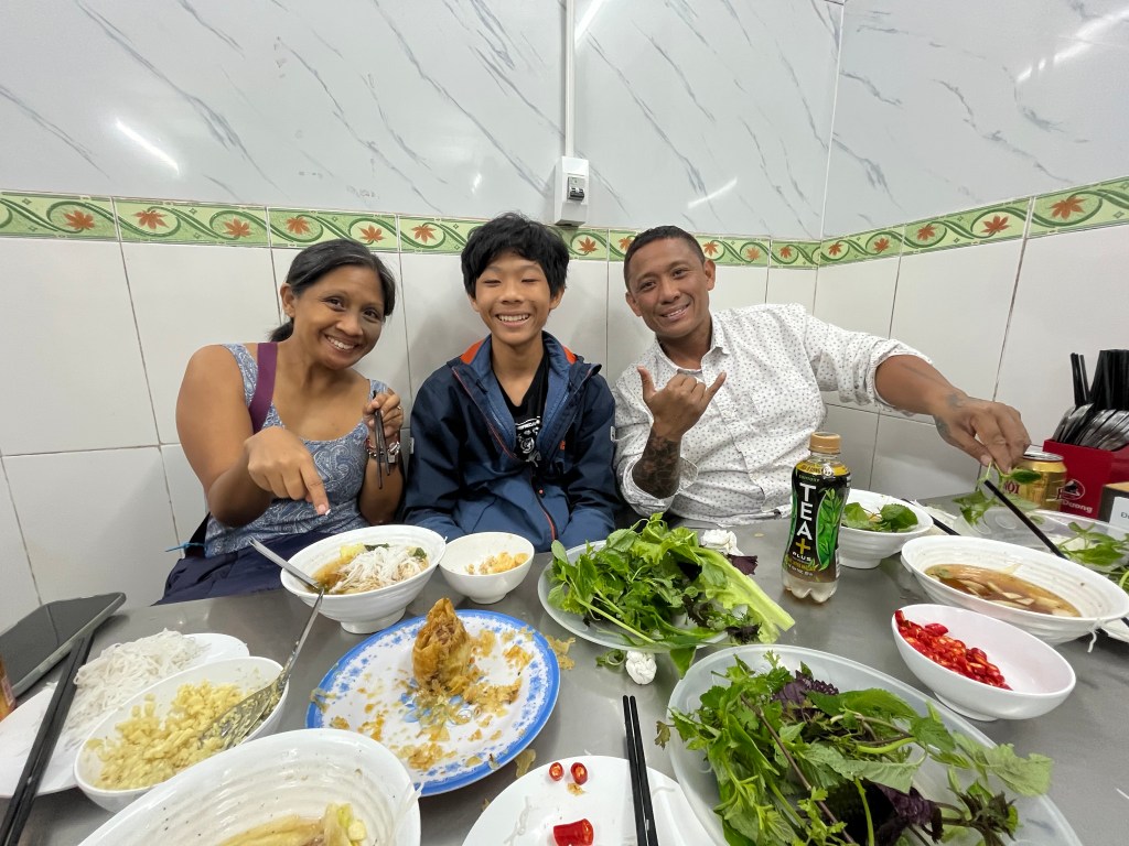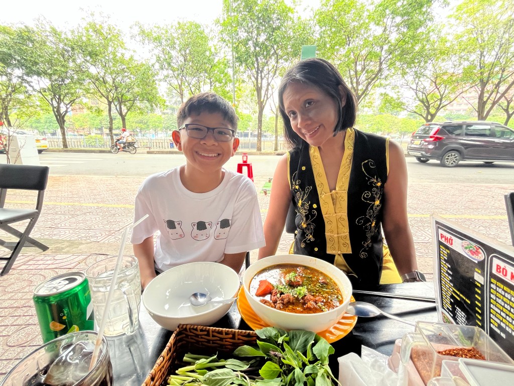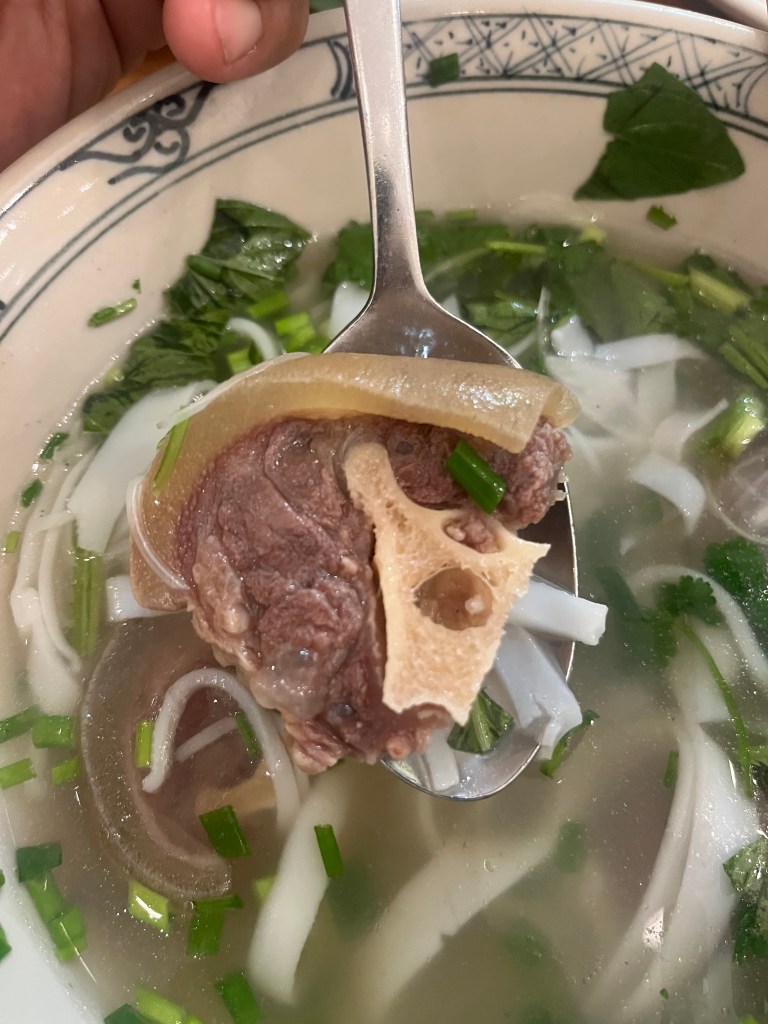 Our “half day” tour lasted 7 hours with drive time! On the way back we got dropped off at a pho place based on John John’s rec-Pho Vietnam where I tried their ox tail pho. Kinds tough TBH and the tails dont quite look like the ones we have. Not bad for under three bucks. June and Hud had the clay pot pho which came out bubbling and hot.