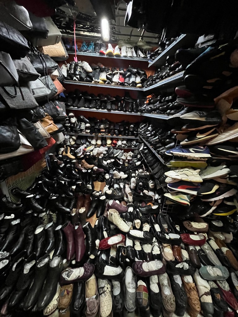 This one place was strange. The upper levels looked really elaborate for the inside yet in the basement where we wanted to look for used clothing the stalls were kind of like a dungeon — super cramped.