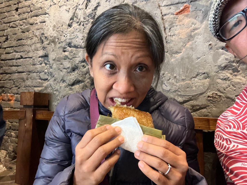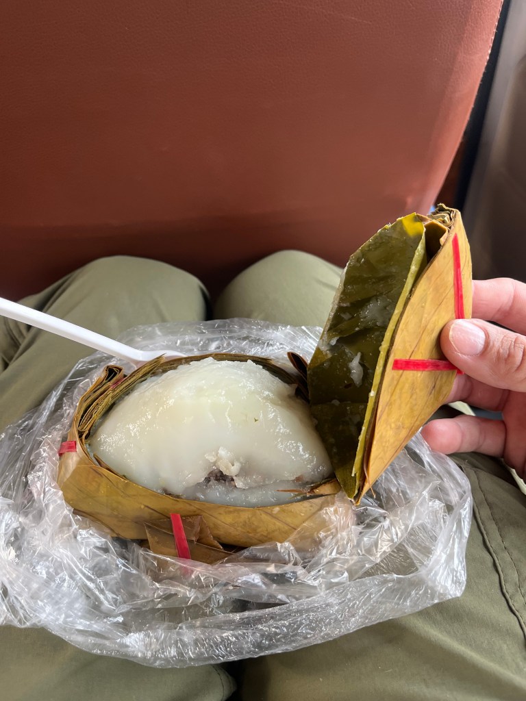 Check this warm, super soft savory rice wrapped in leaf. The inside is a mixture of herbs and ground meat. It’s like eating a solid jook skillfully wrapped in leaf.