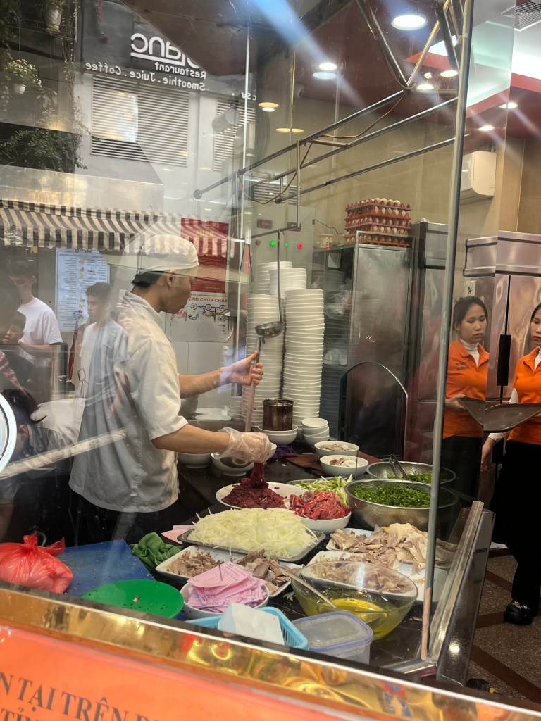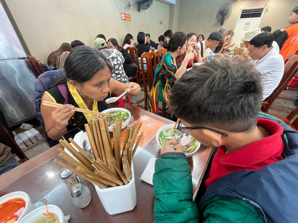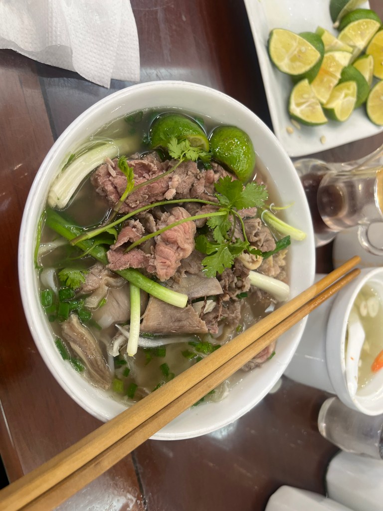 They cranked out bowls of pho to guests mixed in on communal tables. Me and Pax sat separate from June and Hud. It was a simple menu of just pho with different meats cooked either halfway or fully. On the tables were pickled garlic and lemons and you could ask for oil sticks or drinks. For some reason this reminded me of a pizza places in Naples we visited.