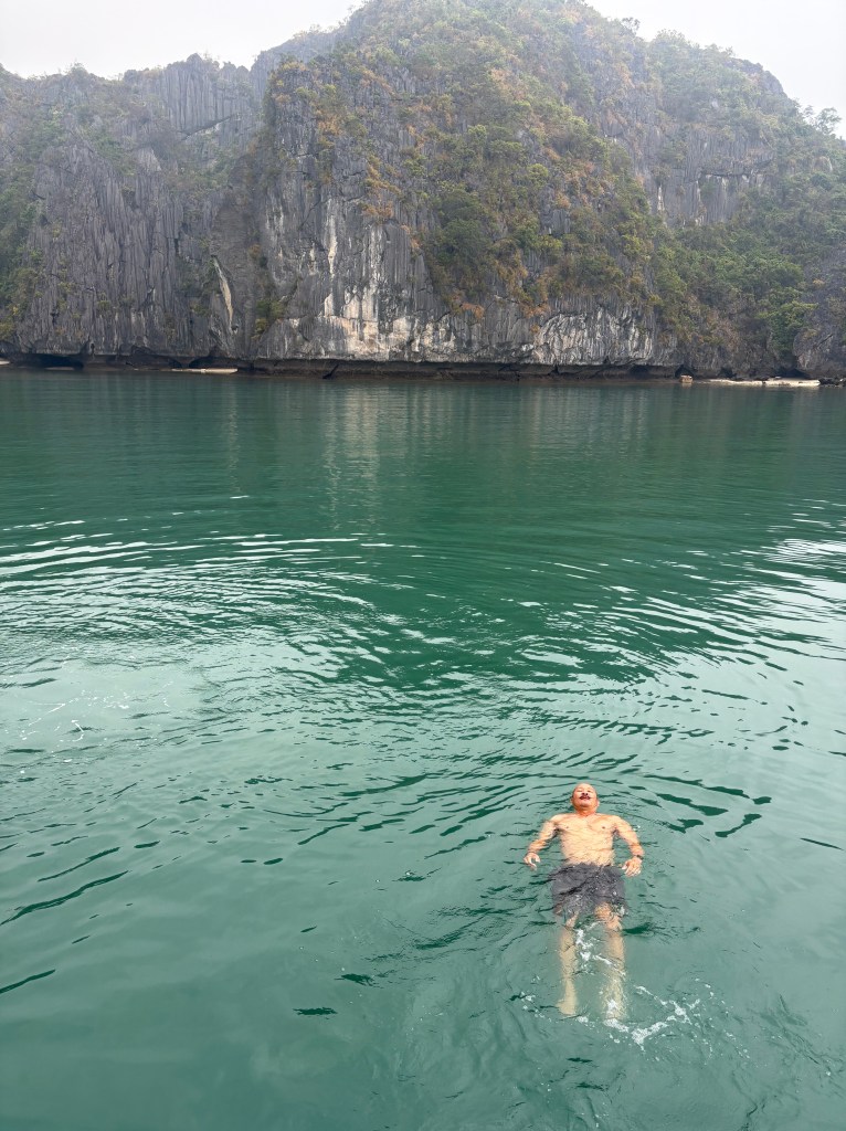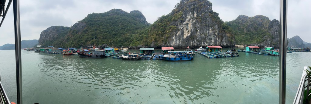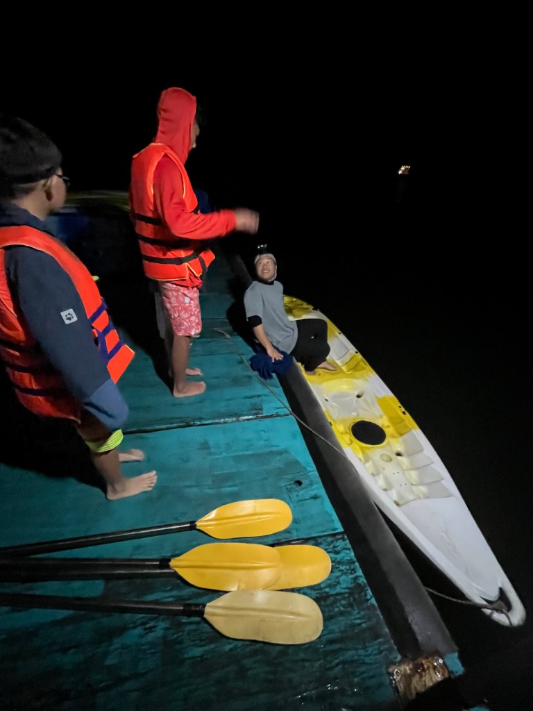 With the help of Bee Travel, June arranged a separate excursion not originally on this tour’s itinerary for us to experience bioluminescent phytoplankton. We jumped onto a speedboat which brought us to a neighboring floating home stay that did the phytoplankton tours. From there we boarded kayaks, 2 people per boat and went into the darkness without lights. The ride was very peaceful. The water was glassy and we would pull up next to the rocky parts of the islands hidden in the moonlight’s shadows where algae were plentiful for the plankton to eat. Agitating the water activates the bioluminescence and little glowing blue white dots magically appear like water fireflies but not as bright or singular. They’re really hard to catch on camera so we didn’t get pics of them.