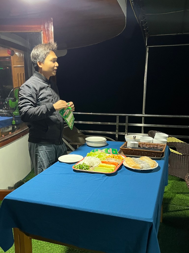 Next we’re heading off to Lan Ha bay to park boat and do a cooking demonstration. We learned the cultural importance of spring roll making. Although they’re standard fare at US restaurants, these rolls are made during holidays when families are together or if you’re away and missing your family. They represent balance of yin and yang. These ones had slices of pineapple in them. Although Ankh called these spring rolls they look more like what I would call summer rolls. What do I know?
