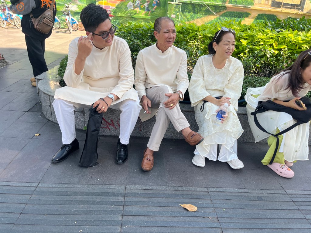 Lots of people wearing ao dai (traditional dresses) going around taking pictures for posting.