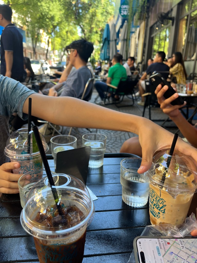 Our pre breakfast consisted of salted coffee(coffee with salted cream) and espresso from a corner coffee shop and a toothy rice and bean thing that I got on the street which is teeming with vendors selling nail clippers, shoe shining services and food snacks. This AHA place had my favorite coffee drinks and everyone sits on little stools in and outside on the sidewalk.