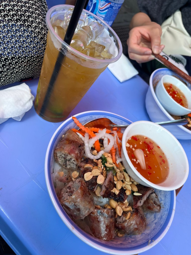 June wanted more spa time so I backtracked it solo to a place selling spring rolls and meat with noodles. I sat across the street since it was full where they were cooking. This lemon tea is awesome. I was drawn here by the smoky smell of the meat cooking on the sidewalk.