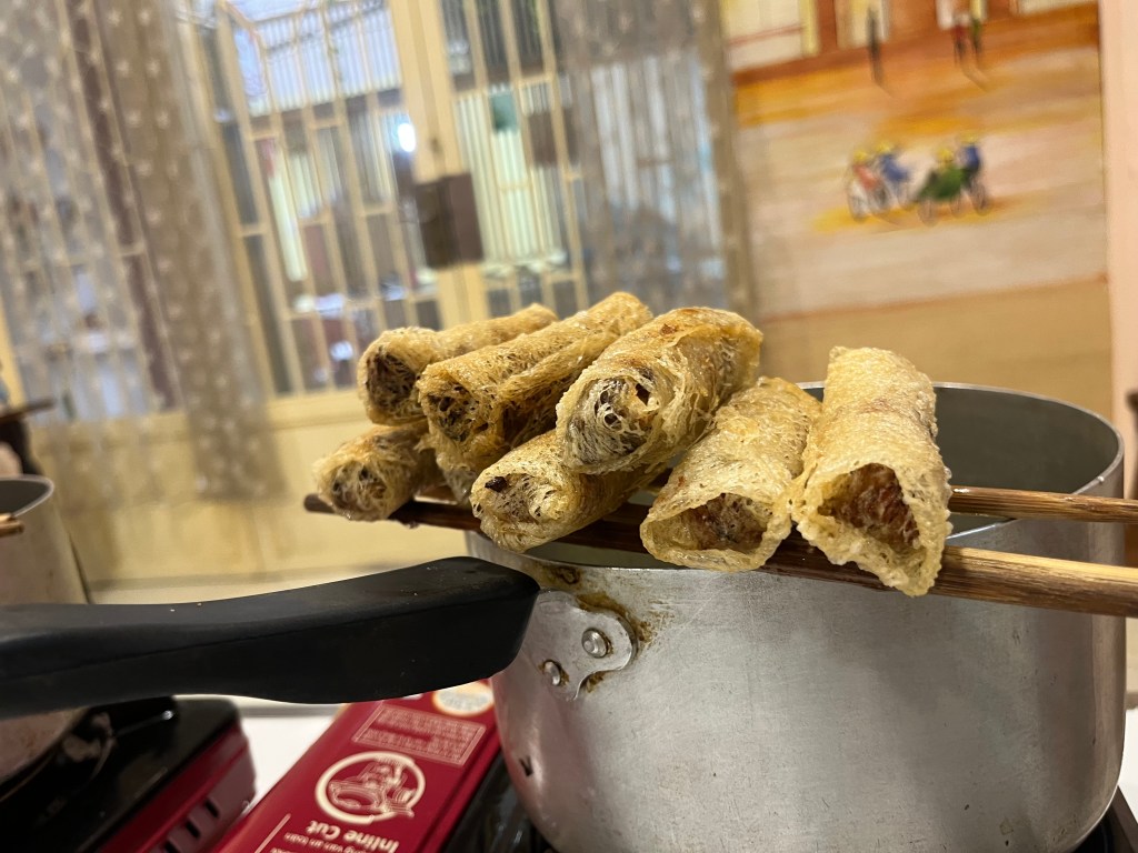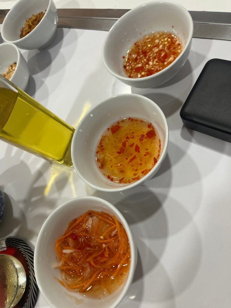 - Spring rolls-the way you judge a fish sauce is if the garlic and chilies are floating or sunken. Floating = pro