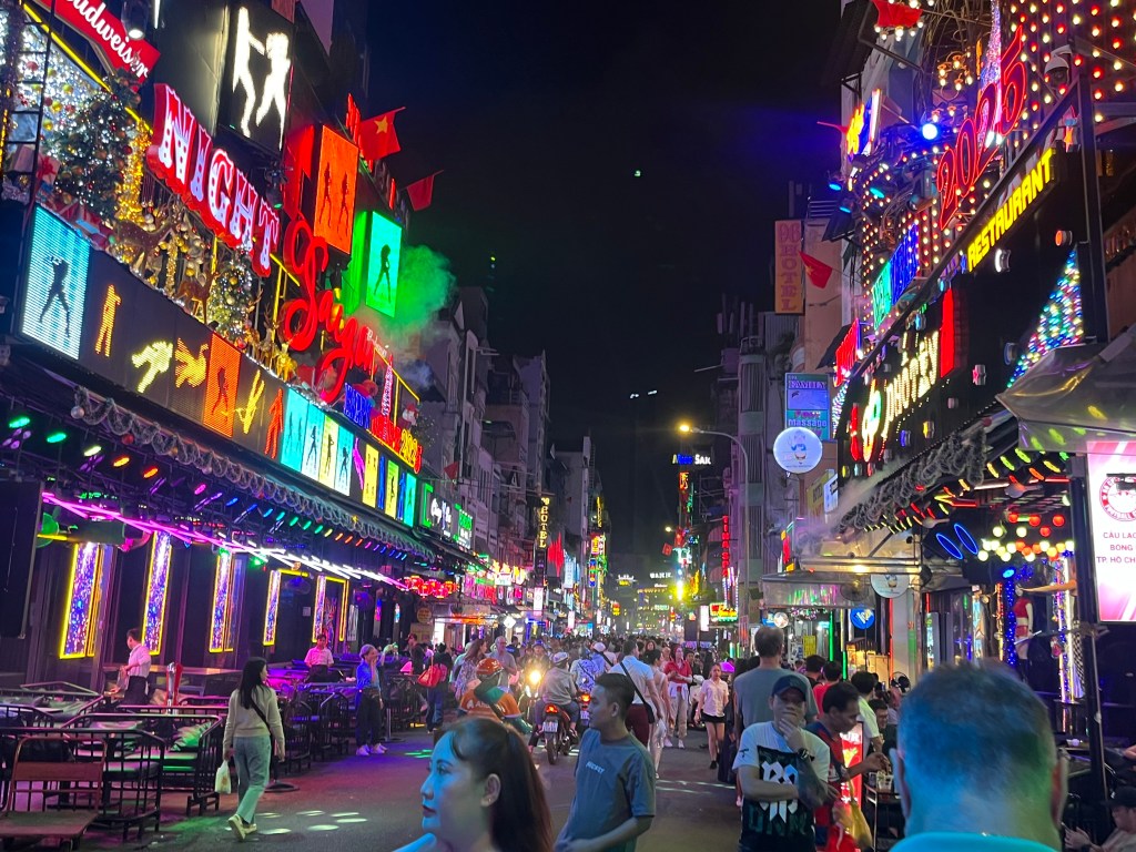 Although my stomach started to not be happy with all the foods I was eating we decided to visit the Bui Vien walking street. I explained backpack style traveling and what a red light district is to the boys. This place is party city. Music blasting simultaneously out of several dark clubs.