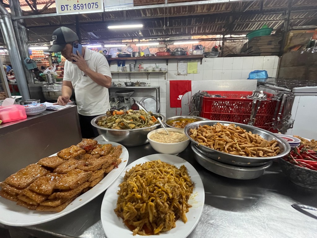 We found food stalls near the rear where we pointed and chose our dishes. Rice with stuffed tofu and some pork. It came with some green onion soup $1.40 us