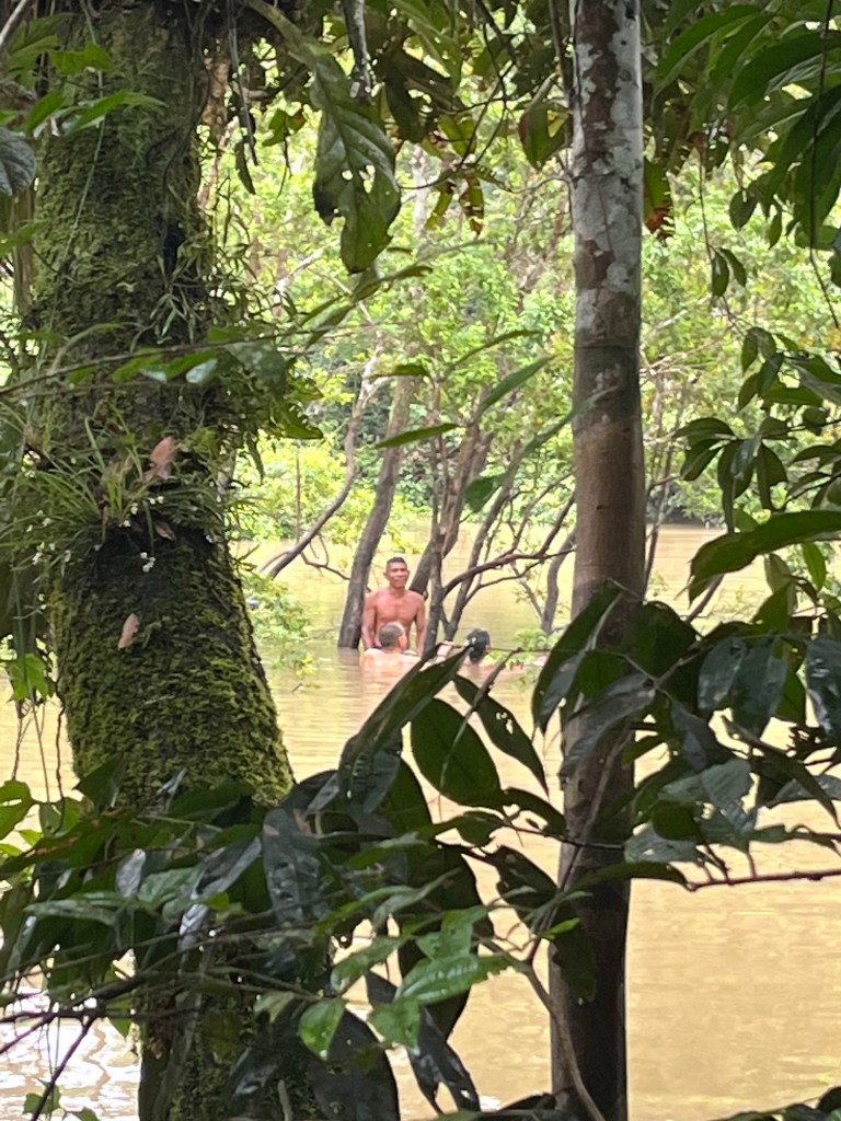 Where the heck are we going anyway? Our shaman reassured us that there were no piranhas, anacondas, scorpions, etc. We swam halfway across the small river, where we felt around for and clung onto the submerged branches of trees and talked for a bit.