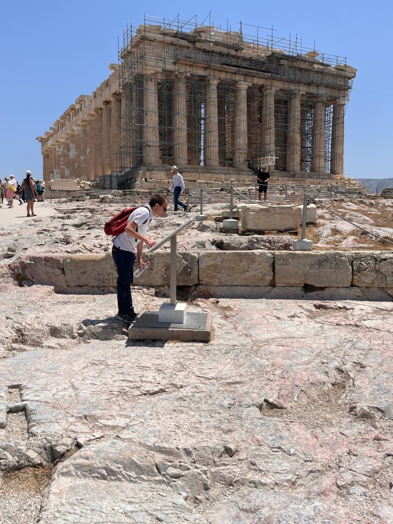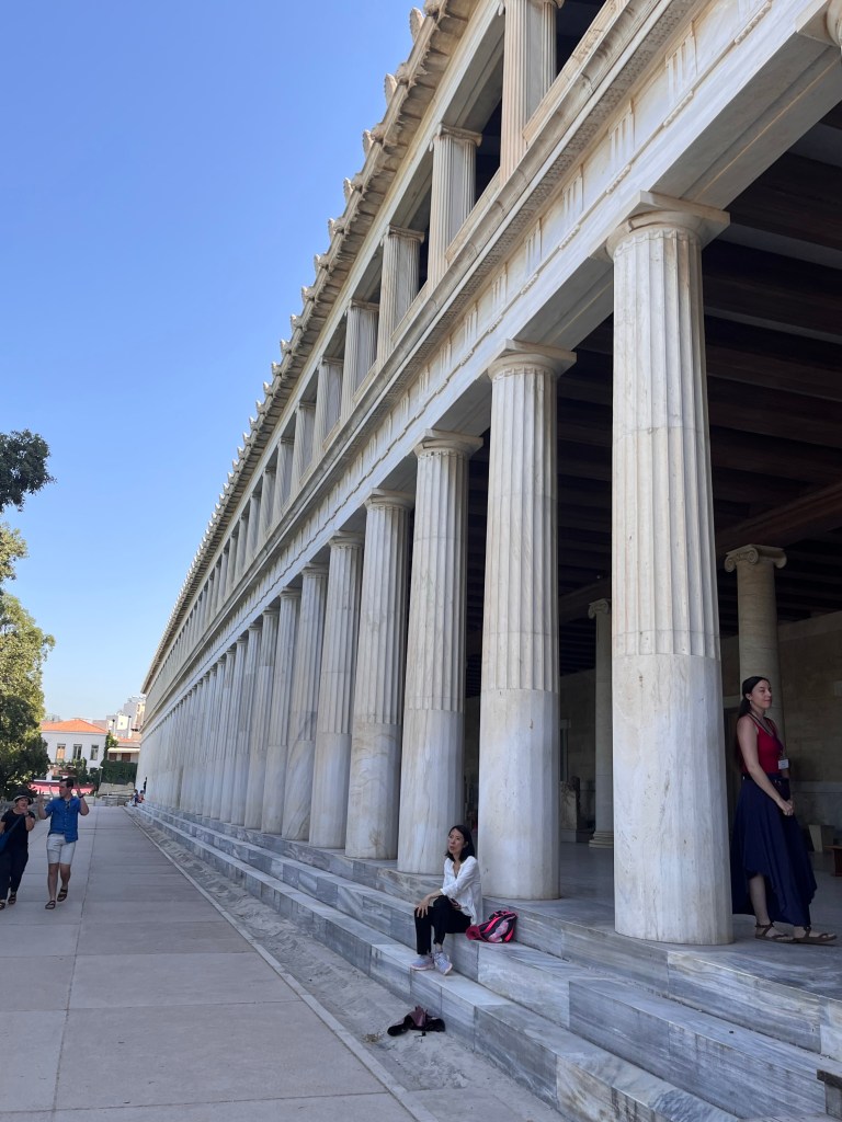 After seeing winding long lines (probably from the 6 cruise ships at port), we decided to first go to the Ancient Agora, sit in the shade to talk and learn about what we’d be doing today first as it would be hot on top the Acropolis.
