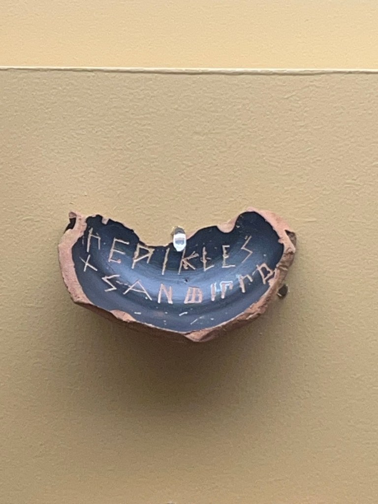 What you might call an unpopularity contest. Names were inscribed inside pottery. If that name was scratched out, you had one vote against you. At 6000 votes you get sent away. All men 18 and over were allowed to vote.