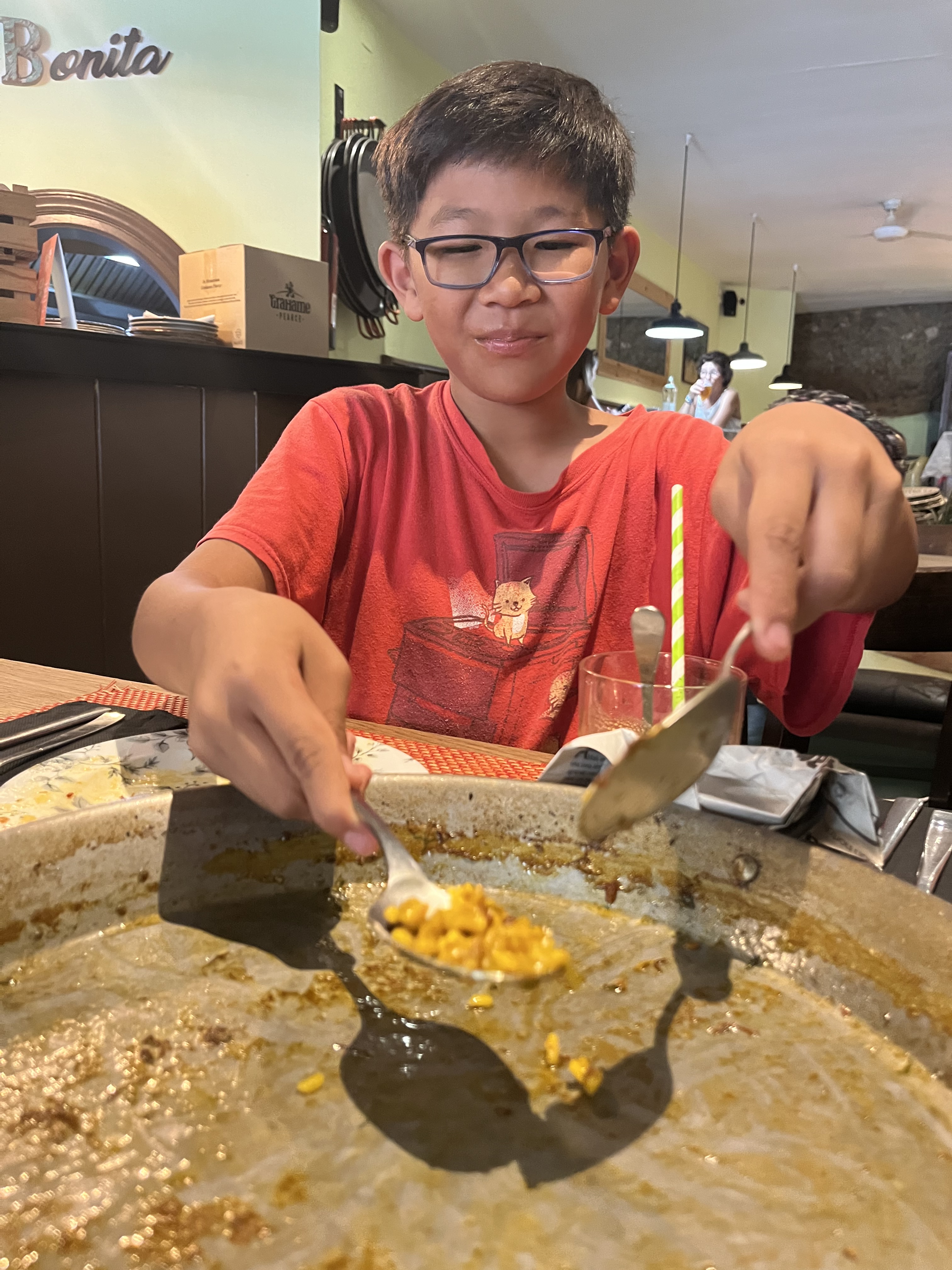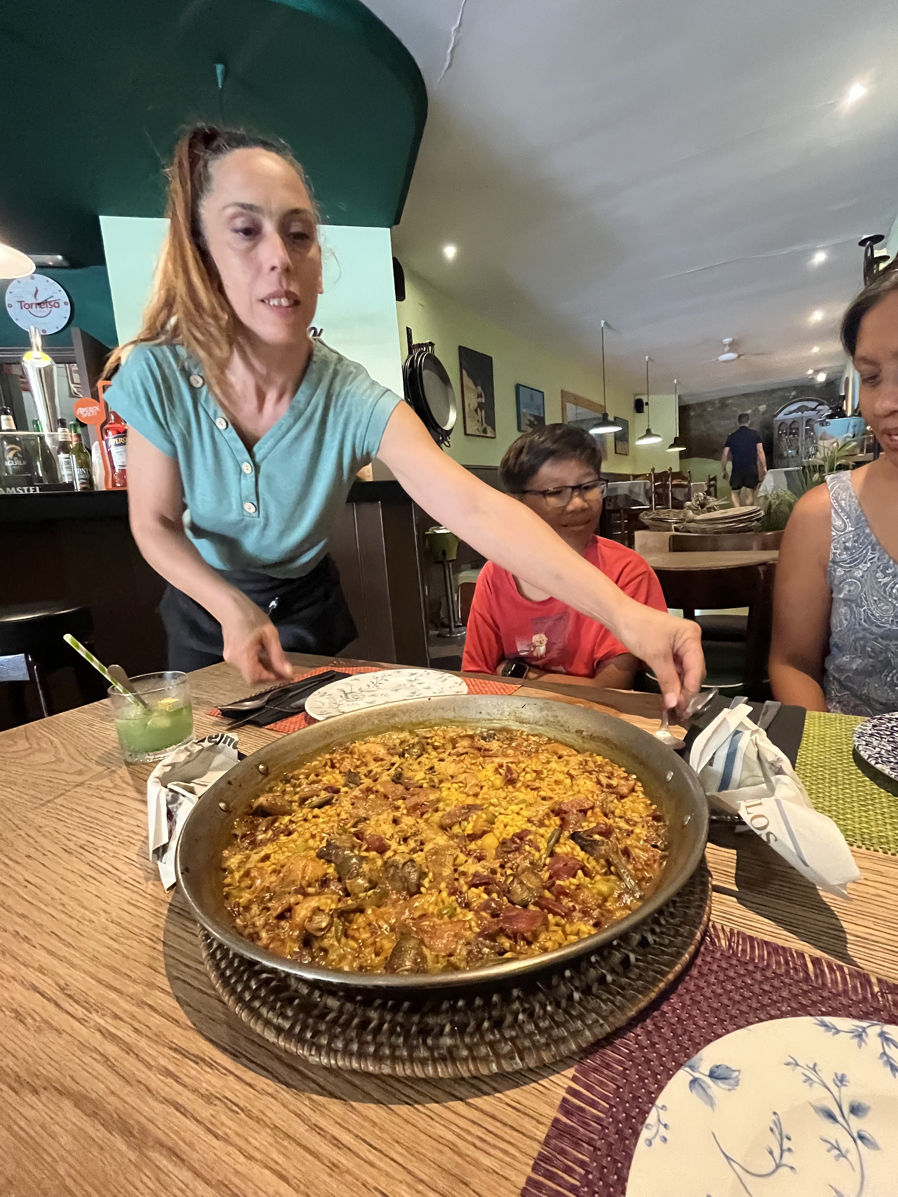 We learned a couple of things about Valencian paella. Kids eat off plates and adults eat right from the paella platter usually starting from the outside and making their way to the center. Waiting at the center bottom is a crust which is the best part. That what our server told us!