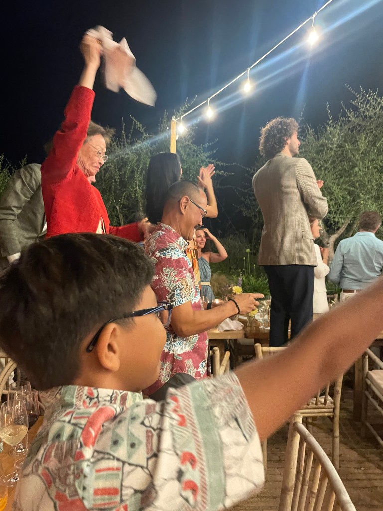 This song that I’ve never heard before begins playing and soon everyone is waving napkins, and dancing on the chairs and tables. So much fun.