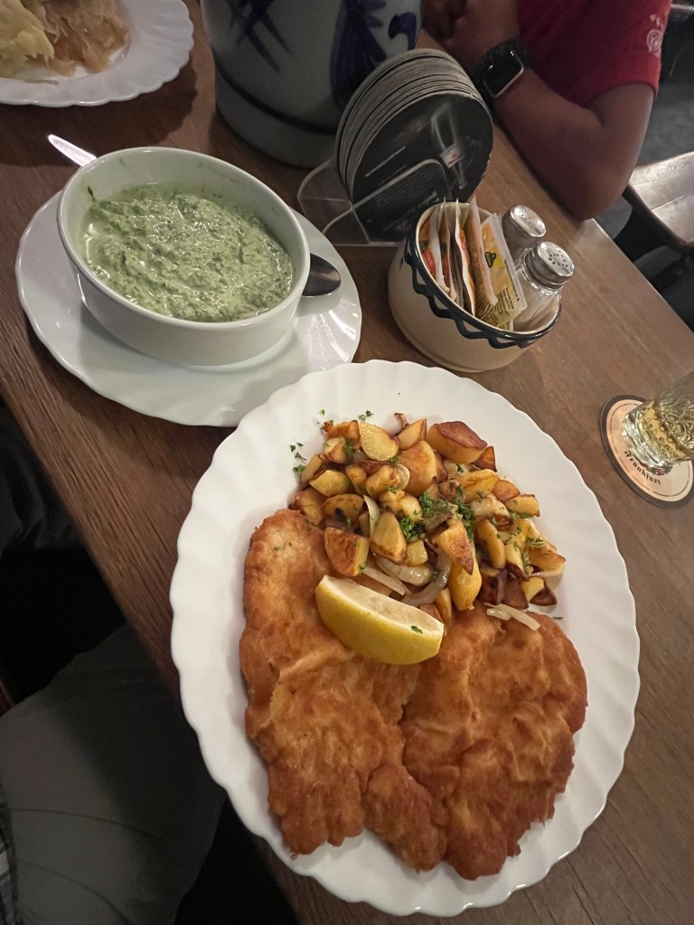 We got a frankfurter schnitzel with grüner SoBe (green sauce). Throw it on everything! Herby and light, a Frankfurt regional specialty. It’s also white asparagus season which I didn’t realize was seasonal and also very popular.