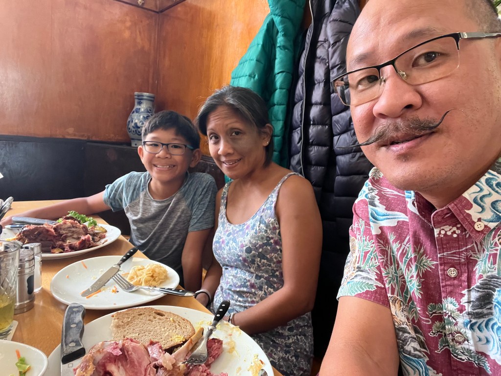 Deep fried pig knuckle with sauerkraut for me and a huge hunk of ham for Hudson. Been waiting for this fella! Well helloooo! I kind of got used to eating meals without rice or plain starch. Day drinking too.