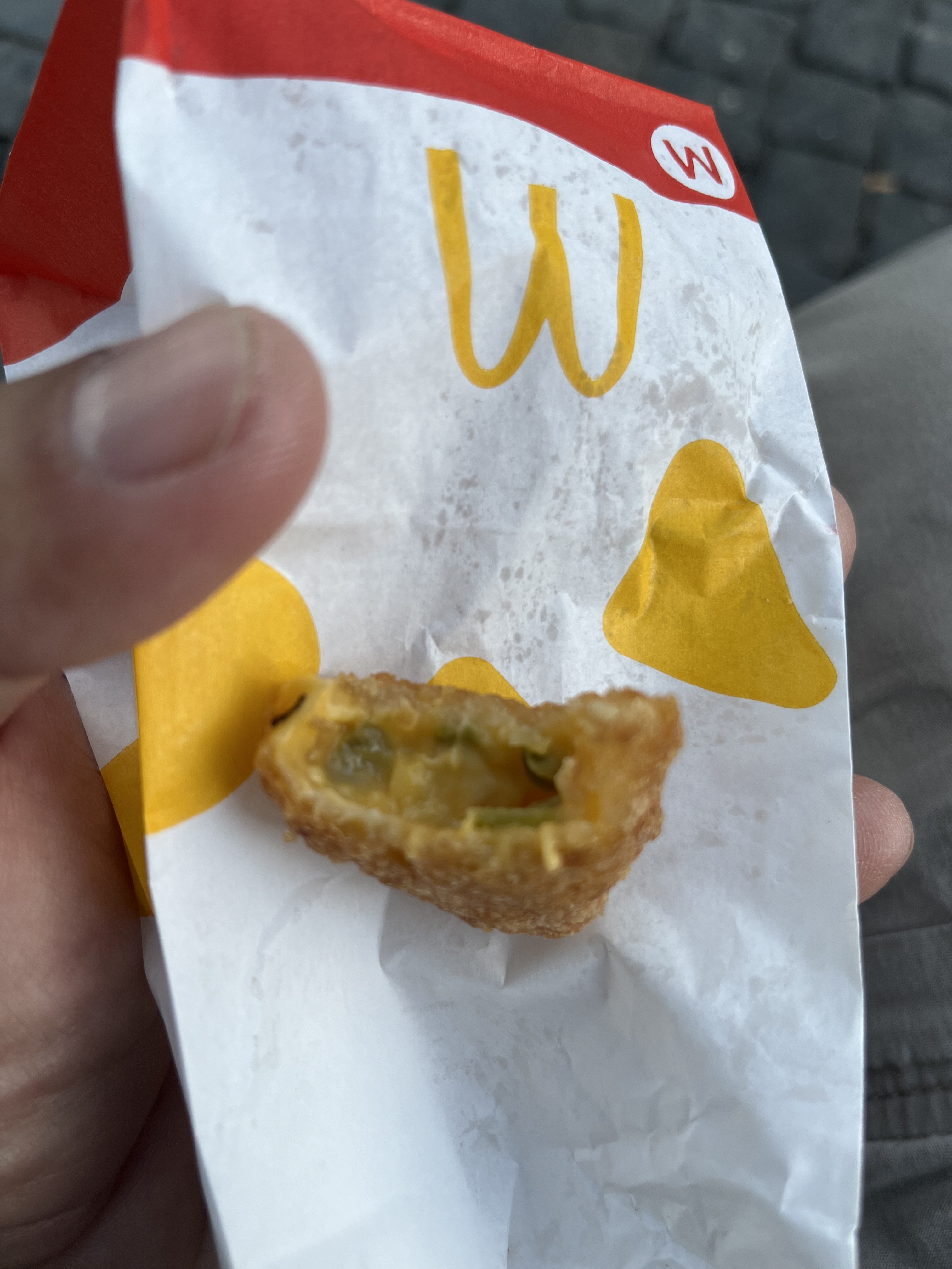 Mcds for dinner. We always do. Potato stuffed with chili (jalapenos) and a bite taken out and a McRib. Year round. How magical. The sauce is different-not as tangy.