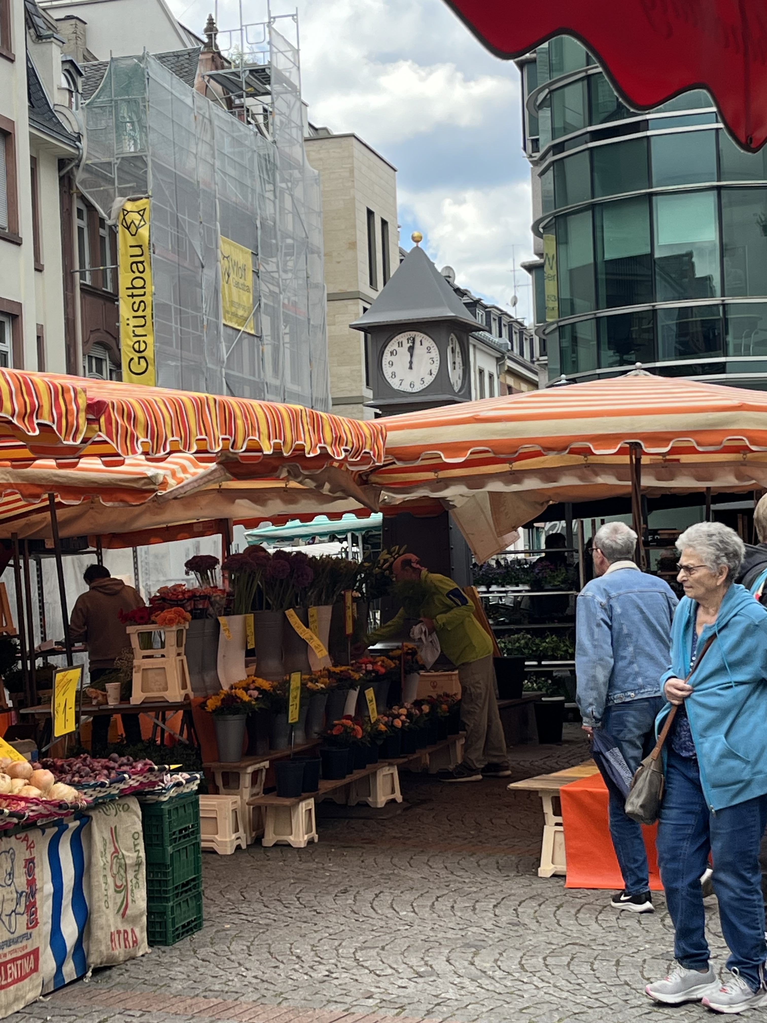 June wanted to go look at the cute clock tower at Berger Strabe. As we popped out of the subway we were surrounded by a market selling foods and veggies. We snacked our way to the end only to find that the clock tower was partially obscured by a florist’s tent. Hah. Oh well it didn’t seem that cute anyway.