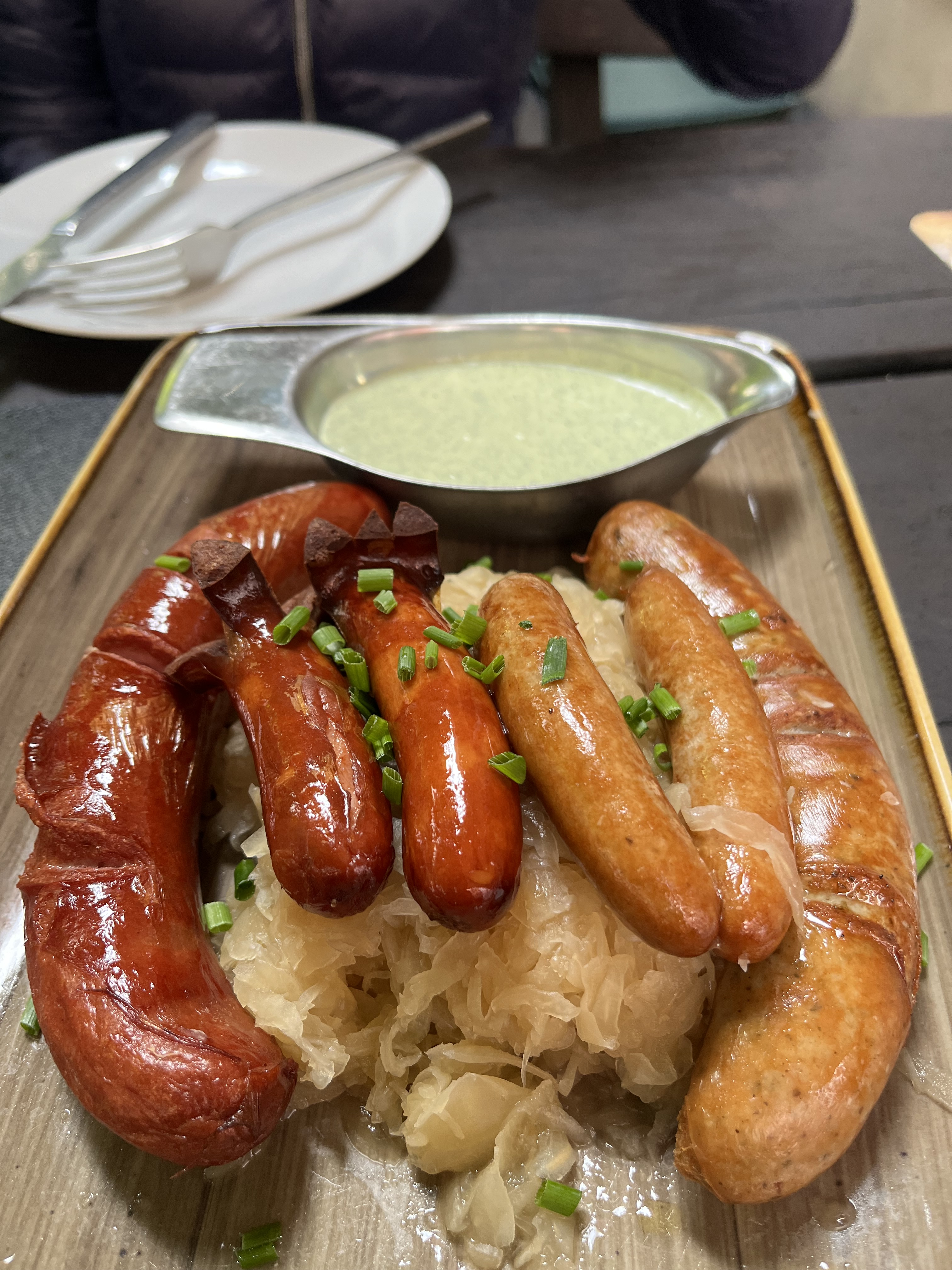 Sausage sampler of beef and pork with sauerkraut, pork schnitzel with fried potatoes and smoked ham and a side of the Frankfurt green sauce. Had to one last time.