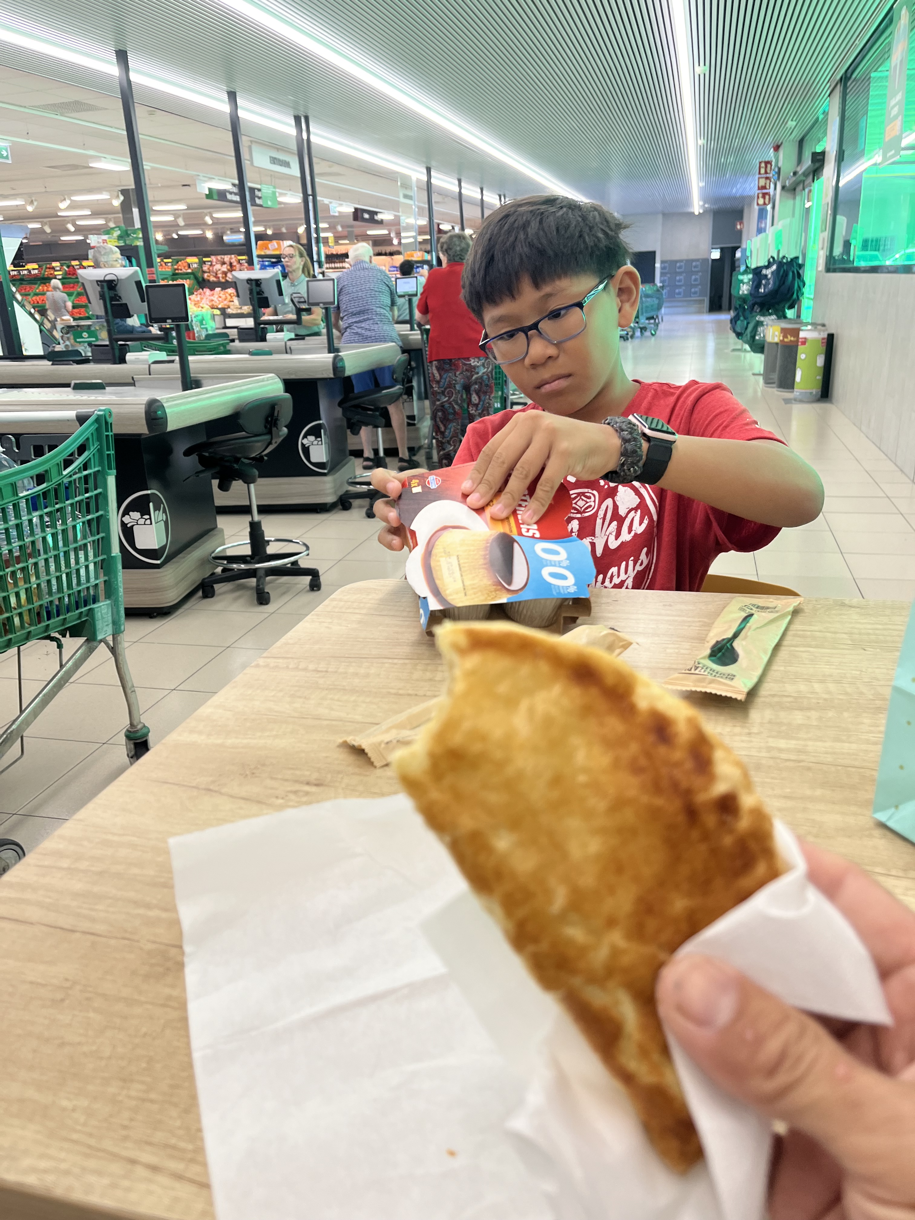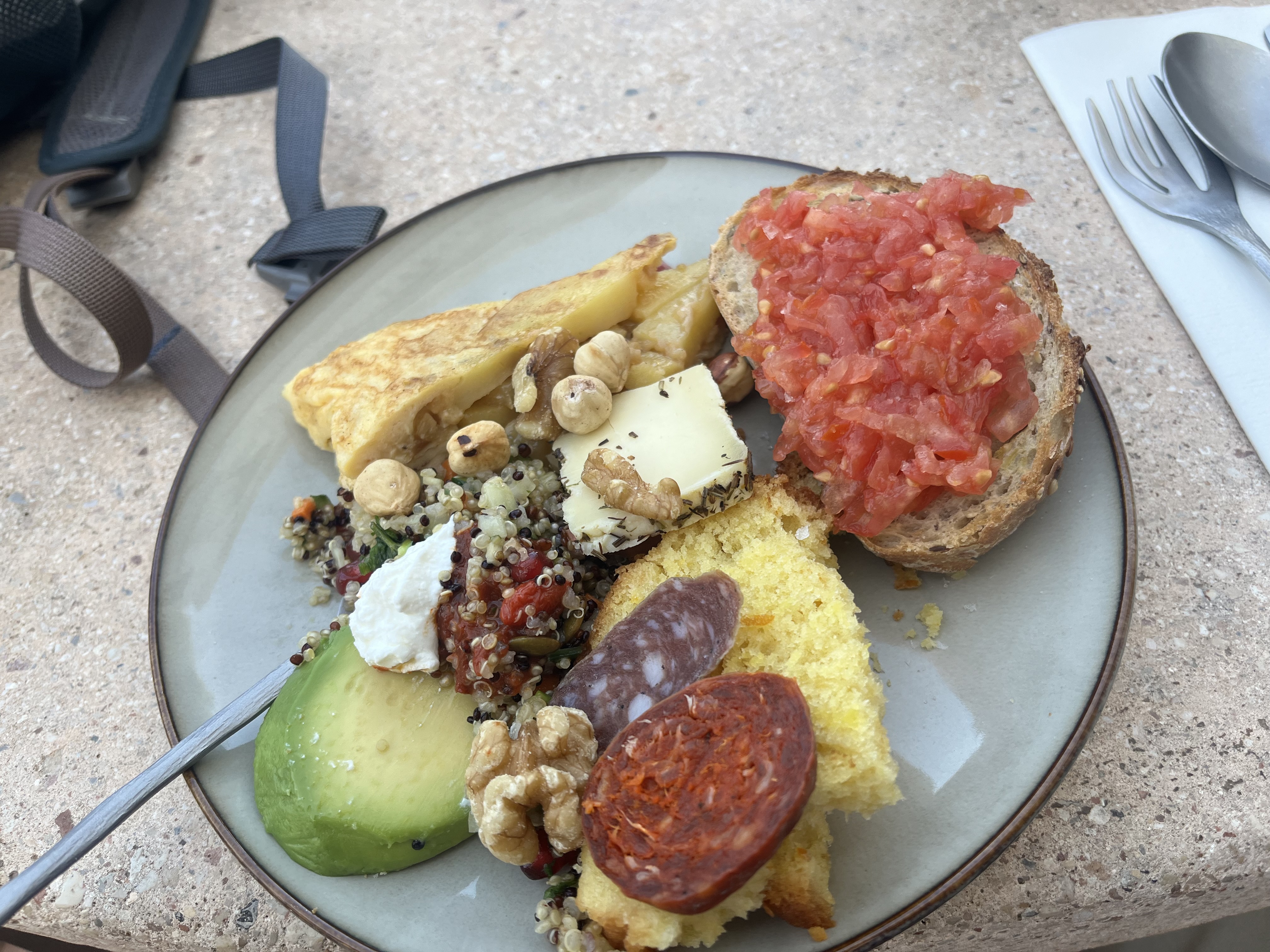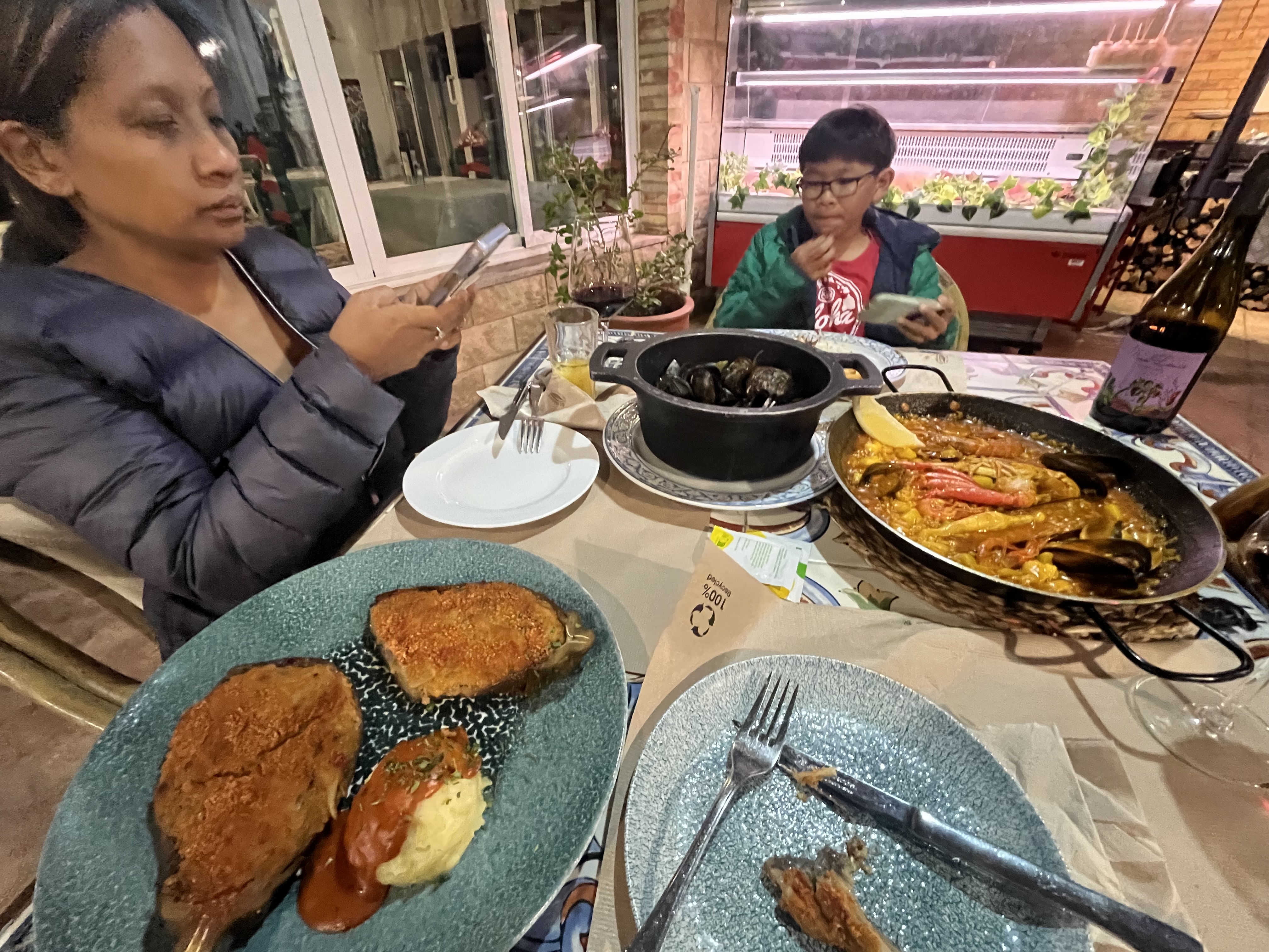After grabbing the rental car we got some light groceries at a large supermarket near the airport called Mercadona. What I noticed were lots of seafood and very little fresh meats. Some chicken and also cured ham. Many items were so inexpensive-a pack of band aids 1.5 euro. Bag of salt 1 euro. Chiccarones-1 euro to 1.5 euro for the one with the fat. We got fresh pastries, a teri chicken bowl (Hudson was craving rice), flan, chips and snacks and wine for 20 euro. I couldn’t believe it. We sat at the front and dined. lol gotta eat somehow.