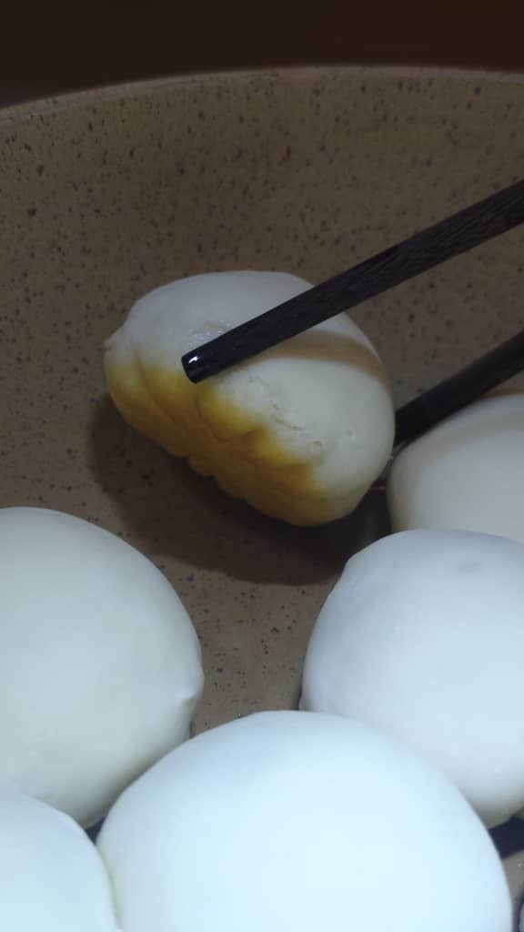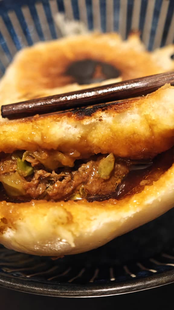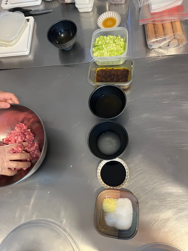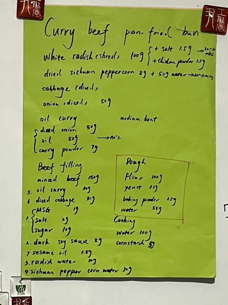The filling for this one was actually pretty complicated with many steps mixing in ingredients one at a time. The filling was a curry flavored beef. For example the added liquid we used consisted of Sichuan peppercorn soaked water and the water extracted from salted cabbage. We mixed the peppercorn water into the meat in three doses. Usually I’d throw the filling materials all into a bowl and mix it one time. For this we mixed after each ingredient to layer on the flavors. We handmade the dough which was flour, yeast and baking powder or soda. I forget, I always mix up the two.