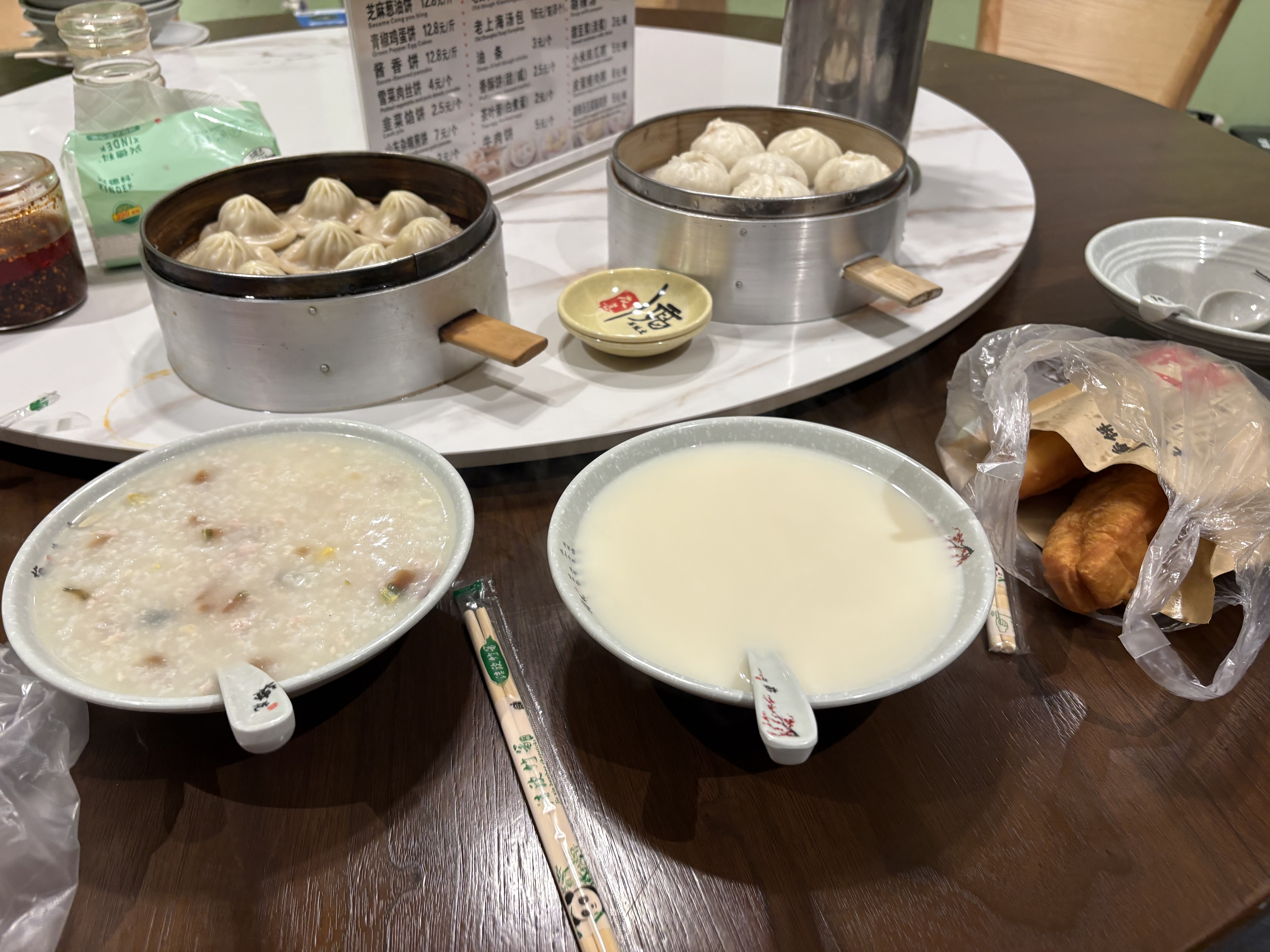 Brekkie of thousand year old egg rice porridge and oil sticks. Cheap and hearty. This is what I love about China. Soy milk in the front right and soup filled dumplings two ways-steamed and fried.