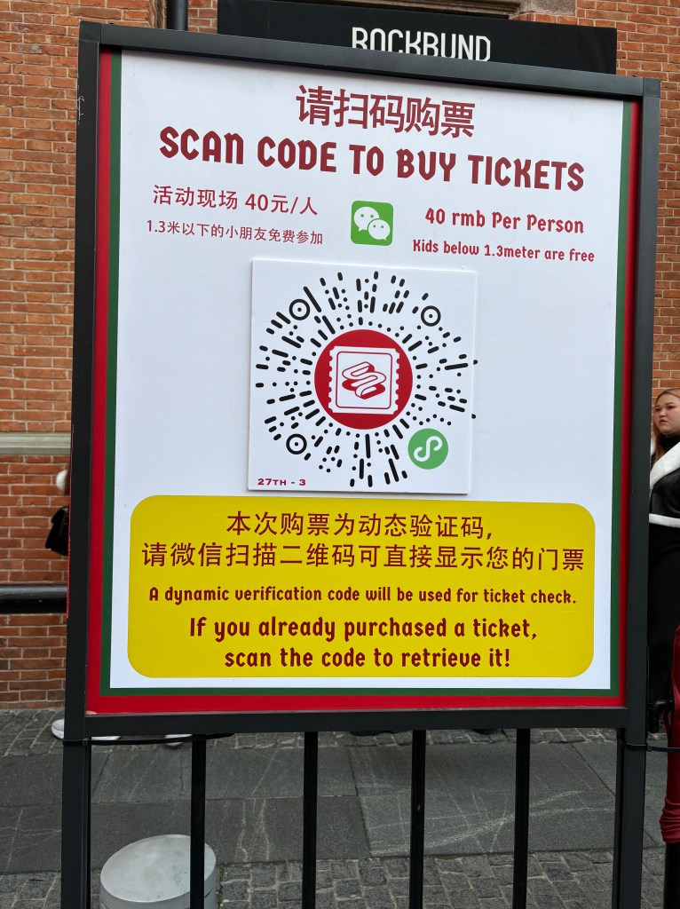 Then we headed back toward the Bund to see if we could get tickets to go to a second Christmas market on Nanjing Road East. Last day today for this one. When we got there the online tickets were sold out. Then someone took down the old QR code posted in the entry and stuck a new one up which we jumped on. June was so happy.