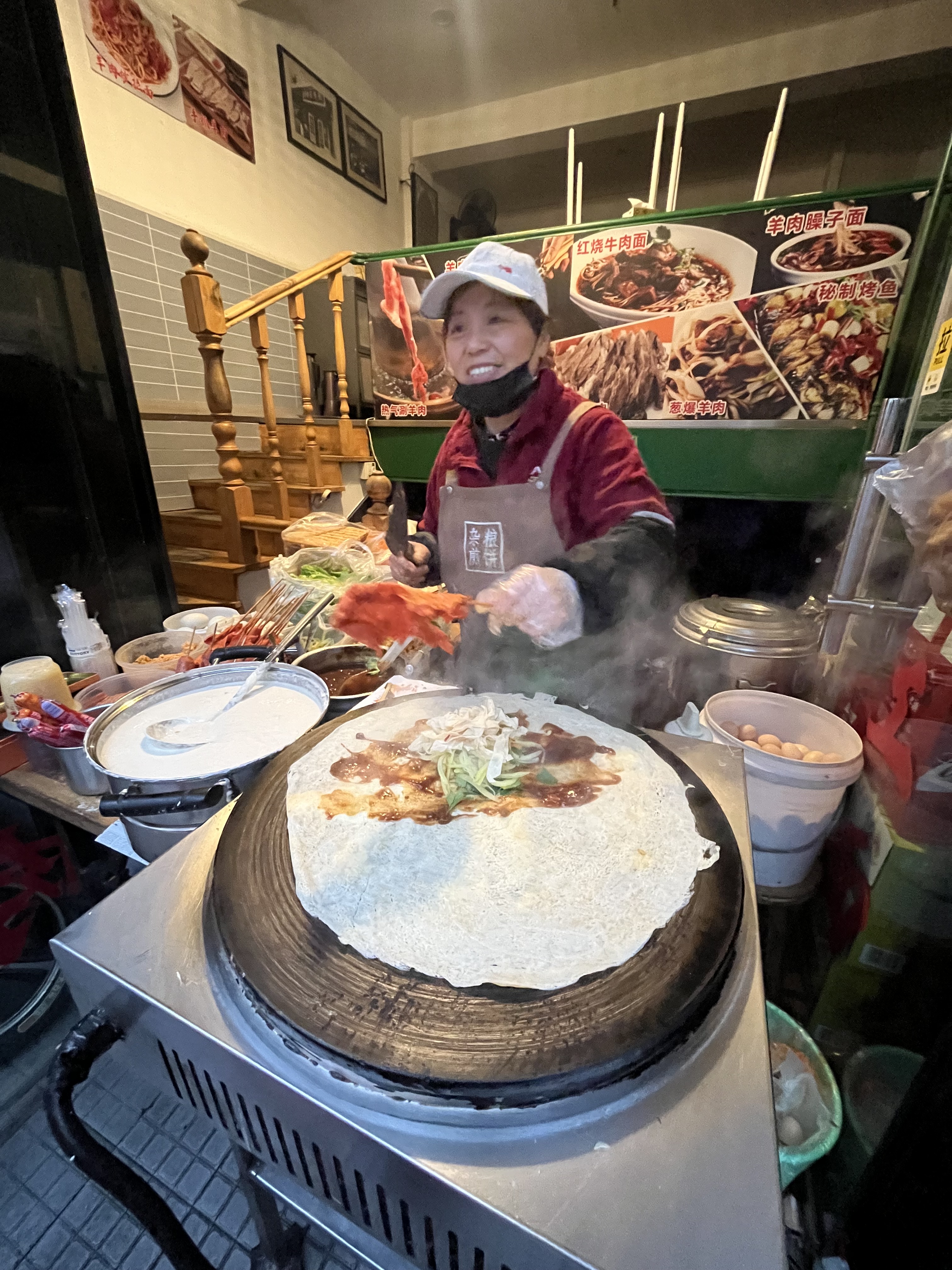 When I first visited Beijing in 1997 for a summer colllege program I first started having these jian bing. They make a pancake first on a hot plate then crack and cook an egg on top. It’ll usually at least have a crunchy deep fried cracker and some hot sauce on it and you walk around eating it like a portable pocket. Ours also had some kind of meat and lettuce. Fresh veggies used to be a no-no when I first started visiting China. With all the fillings we got this one was just under three bucks US.