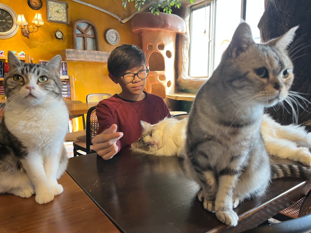 So many friendly cats that jump onto your lap and want to be pet. Kinda gross at the same time because a few were sick and would sneeze boogers all over every so often. Maybe something was going around at the time.