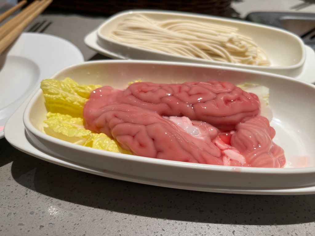 After Maodao cat island we looked for a late hot pot lunch and ended up at a place called Haidilao. Big lunch. $50 us got us a full meal including drinks for the three of us! I also got to order pig brain.