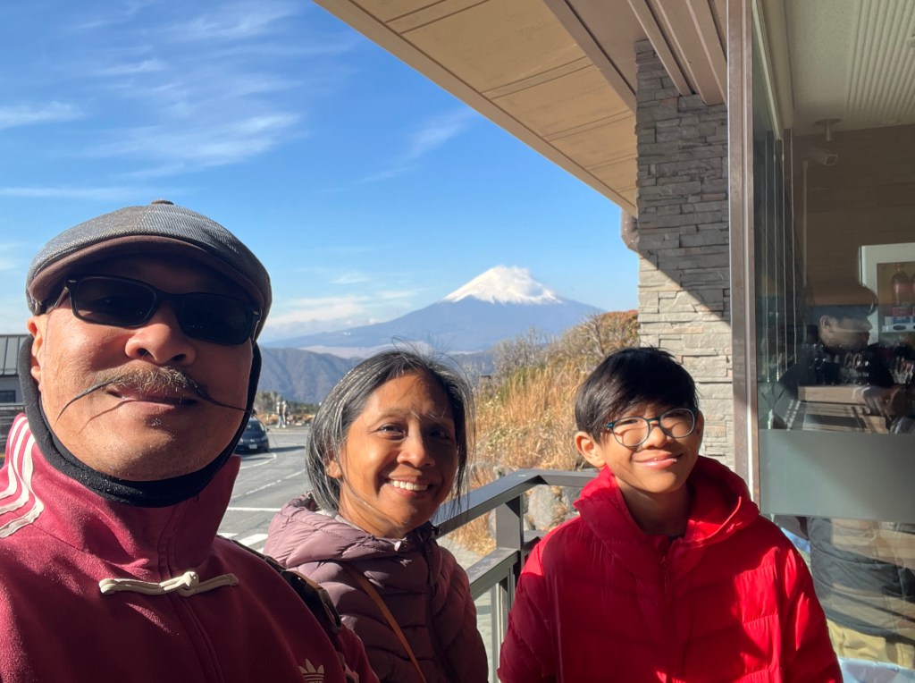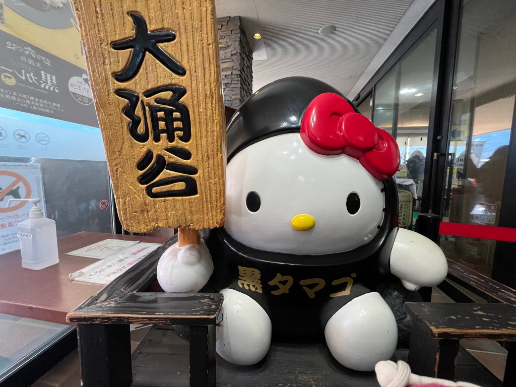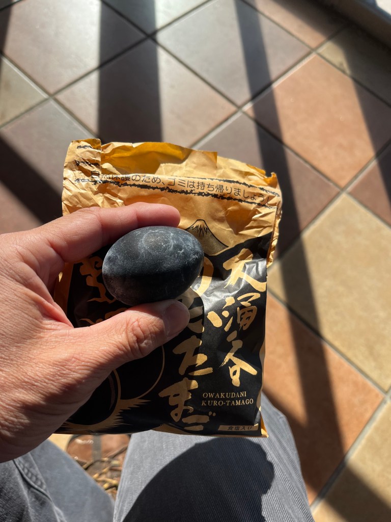 Then to the peak where we saw sulfur coming out of the old volcano and had enjoyed black eggs in the freezing wind with Mount Fuji as the back drop.