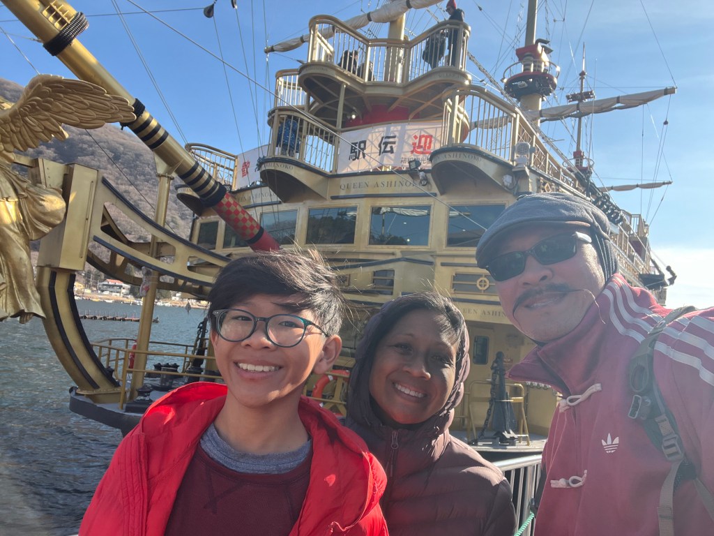Then we cable car-ed back down to Lake Ashinoko, grabbed omurice at the concessions and boarded what the pass calls a pirate ship. It was pretty ornate! I was expecting the type of metal tanker ferry you’d take from Manhattan to Staten island.
