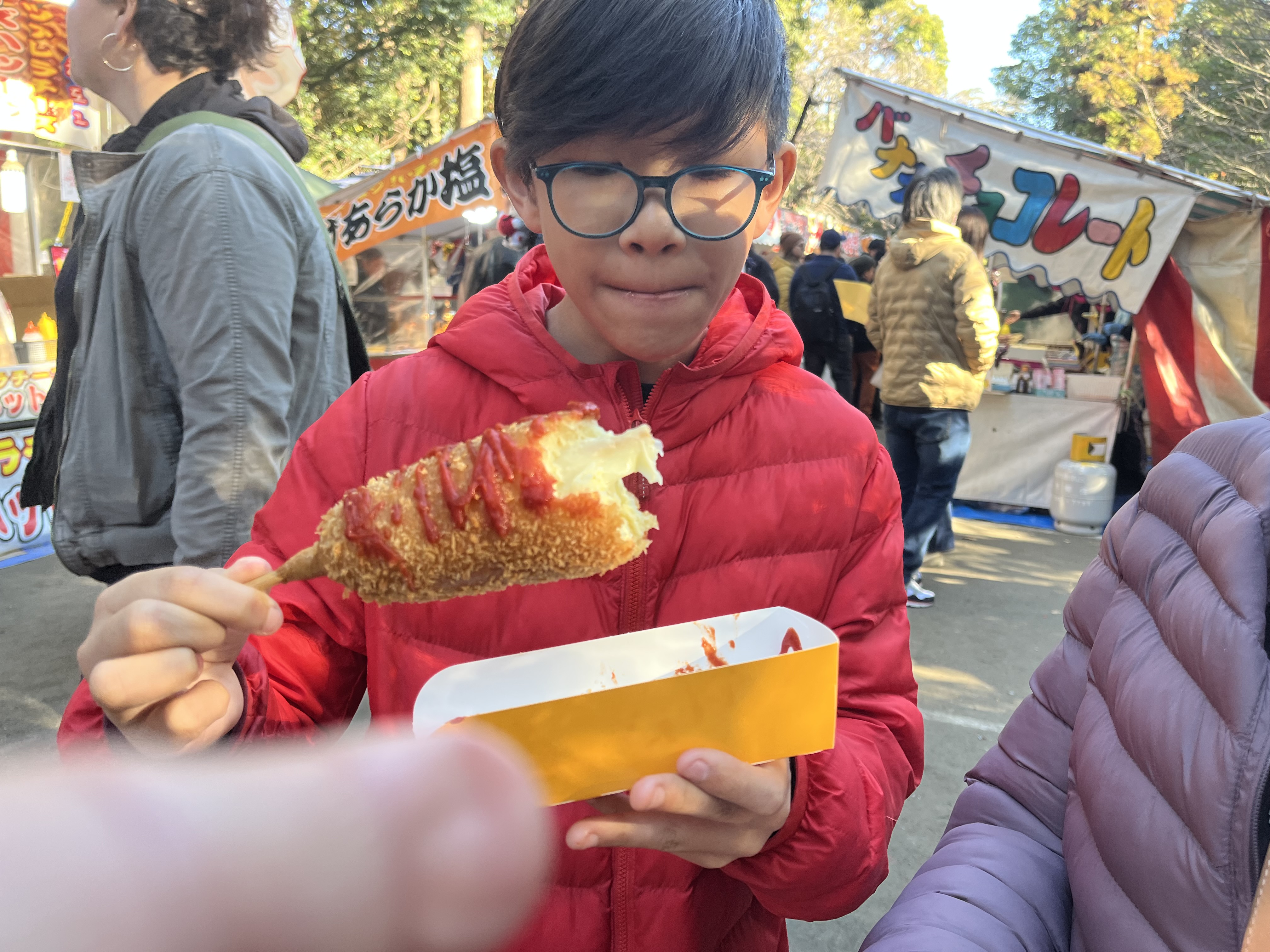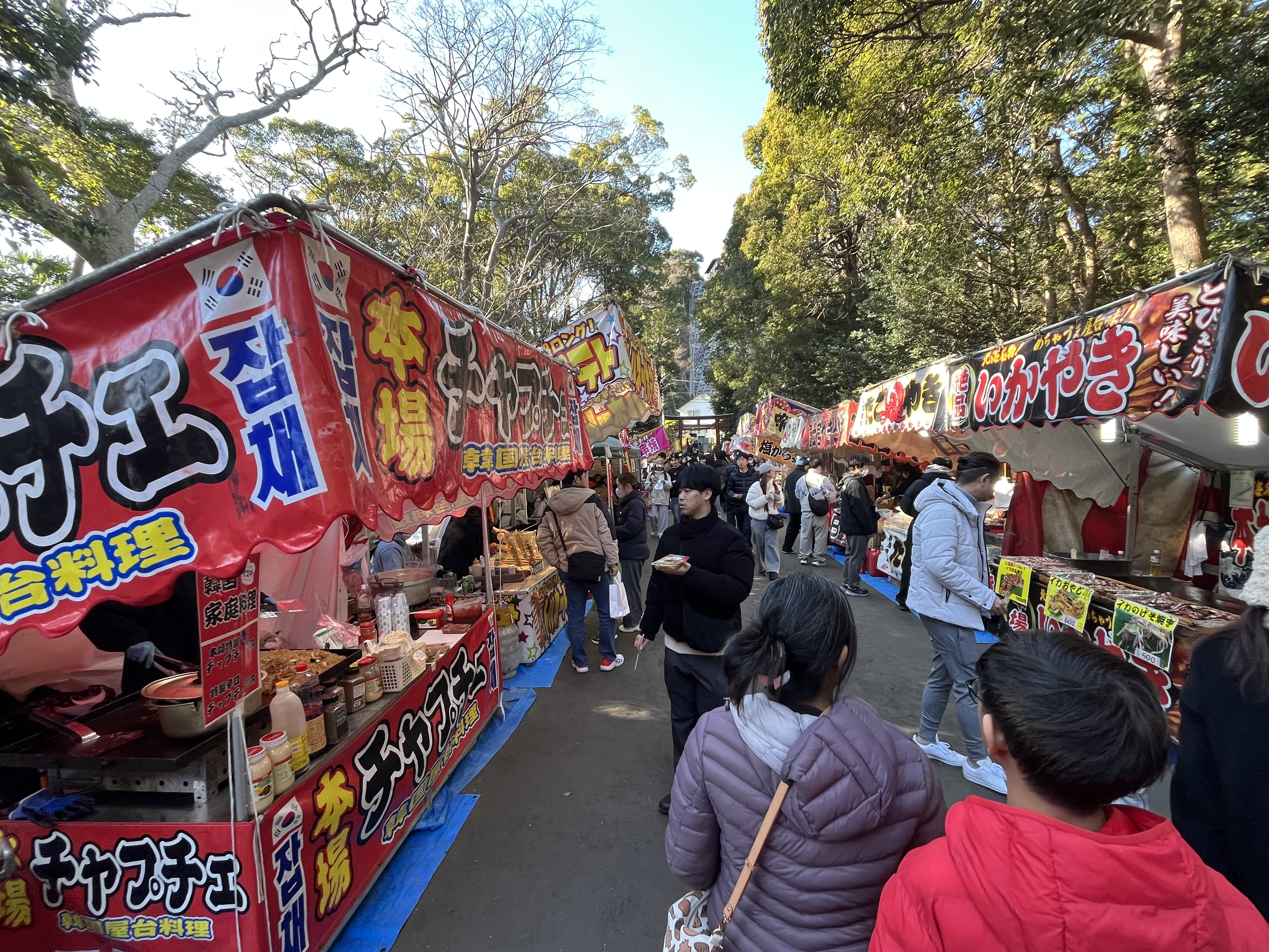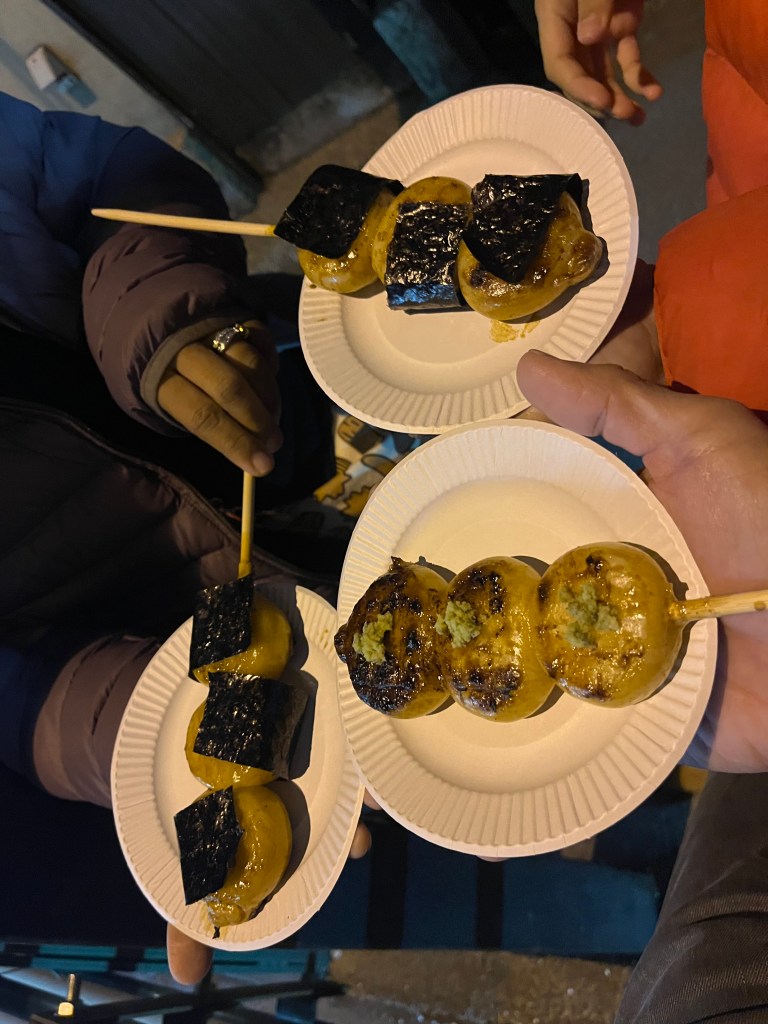 Tsurugaoka temple is where most of the visitors are coming here to visit as it’s New Year’s Day and people want to get blessed for the upcoming year. Halfway in we stopped at a mass of people waiting to enter the shrine and decided to opt out of charms and grab snacks at the many food booths lining the pathways.