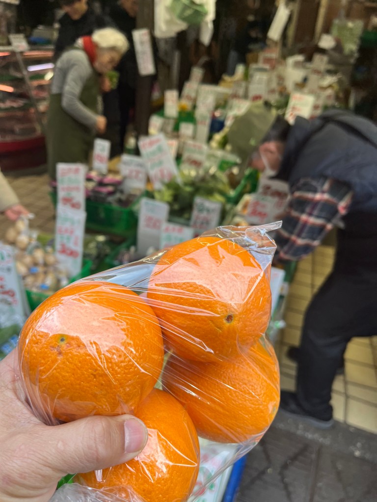 At Yanaka ginza Main Street we purchased some oranges from a grocer for New Years. The first ones we picked looked nice and had leaves on them but the vendor said they were for juicing and would be sour. She recommended these instead.