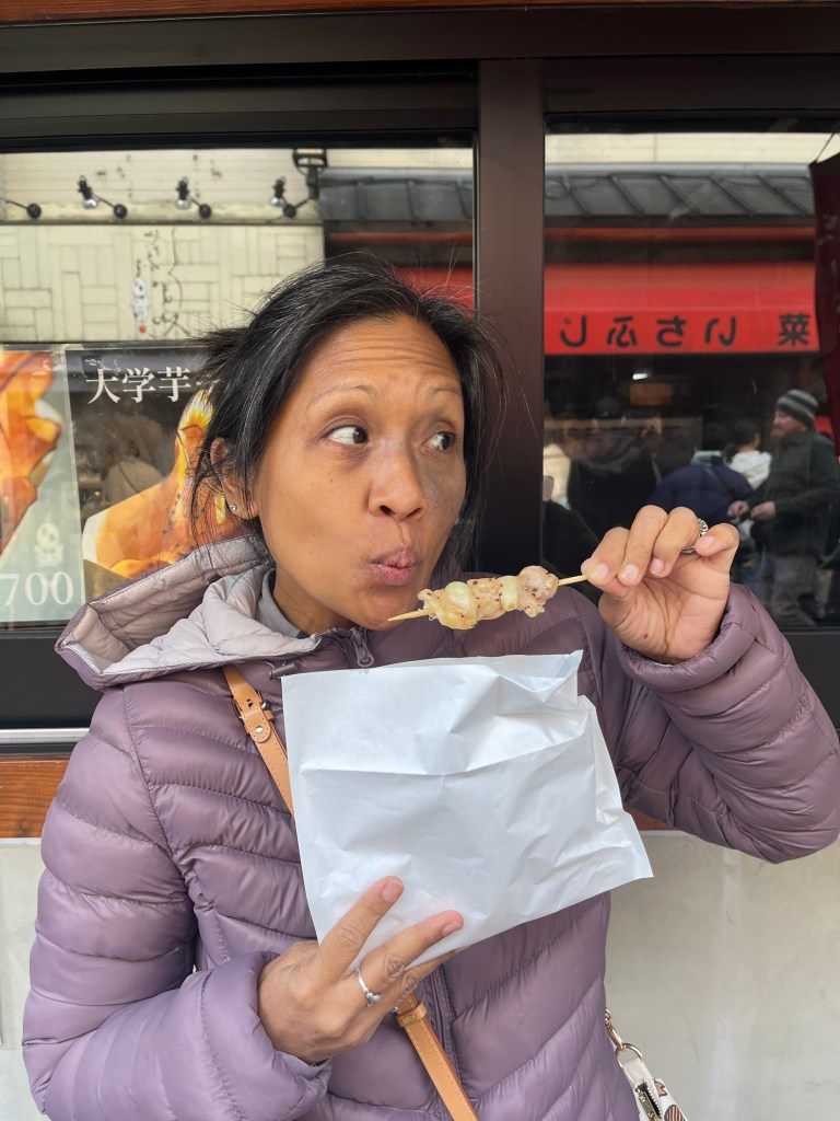 June set her eyes on a yakitori place. As we stood in line I slowly realized this place was not friendly to tourists. “No translate”, ” no picture “, “cannot buy tempura if no live (here)” and “no hands” signs dotted the already crowded stall frontage which was mostly obscured by a snaking line of customers.