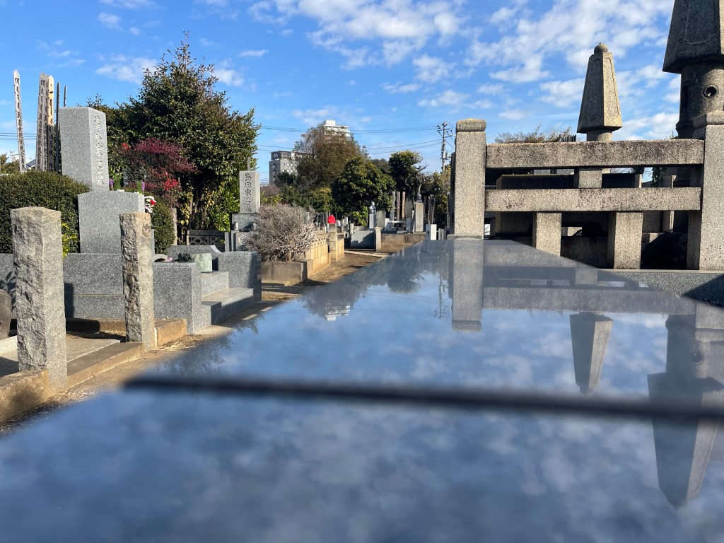 The cemetery ended up having no cats. None. It was (just) a Shinto(?) cemetery with granite stonework underground graves with the main distinguishing characteristic being these long (4′?) flat wooden sticks in stick holders.