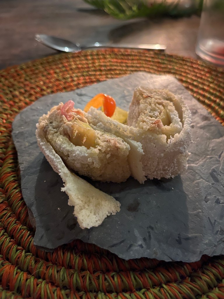 Catfish and cassava tortilla wrap on a slate plate for appetizer! We did that!