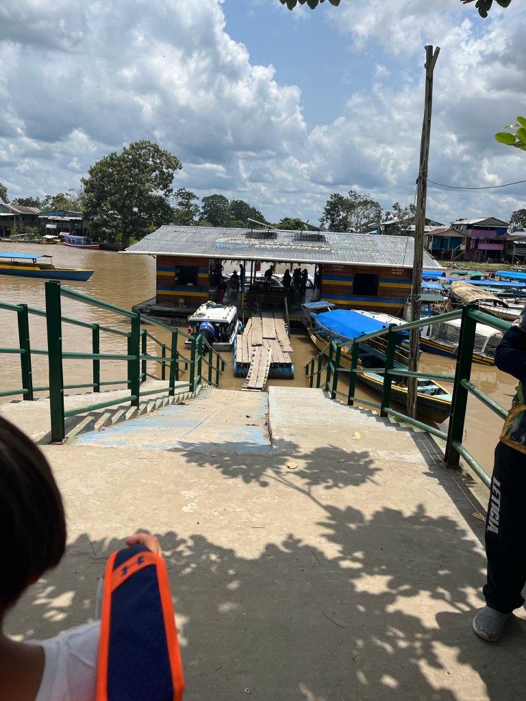Looking at the map, I imagined our boat ride would take 15 min to get from Leticia to where we were staying-the Calanoa Lodge. It ended up being more like an hour plus to get here. This is what we pulled up to.
