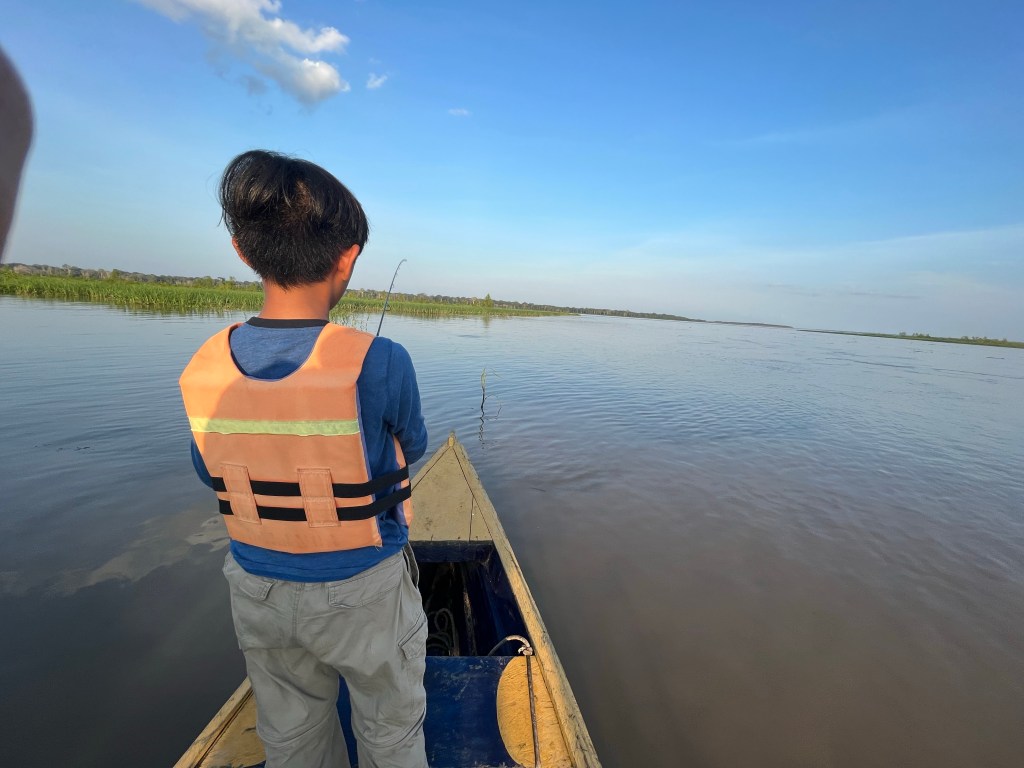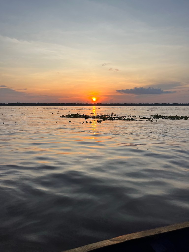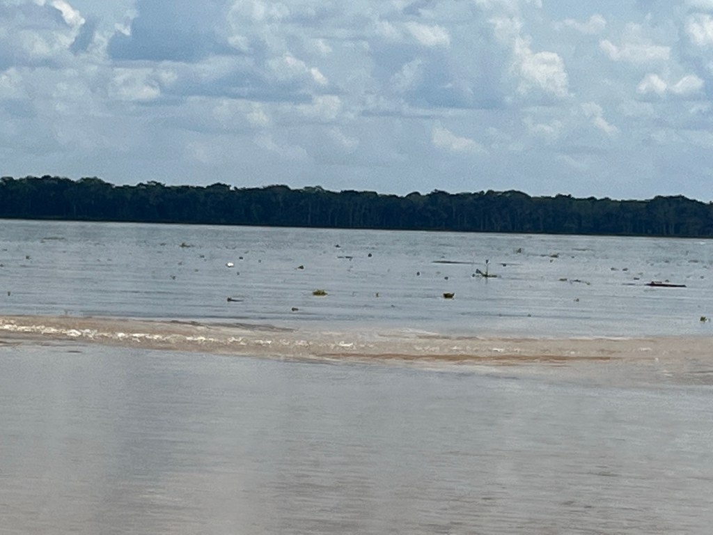 Once we launched we stopped midway in the water. Here we are at the meeting point of Colombia, Brazil and Peru. The floating stuff is mostly floating pond plants and loose chunks of wood floating around.