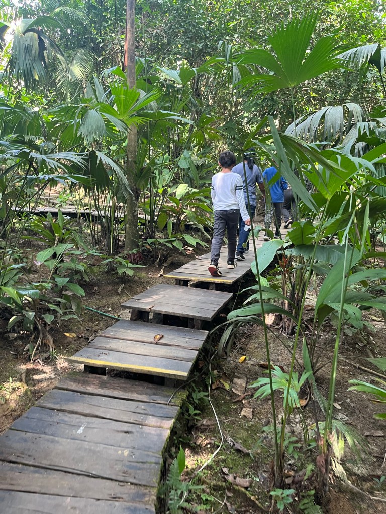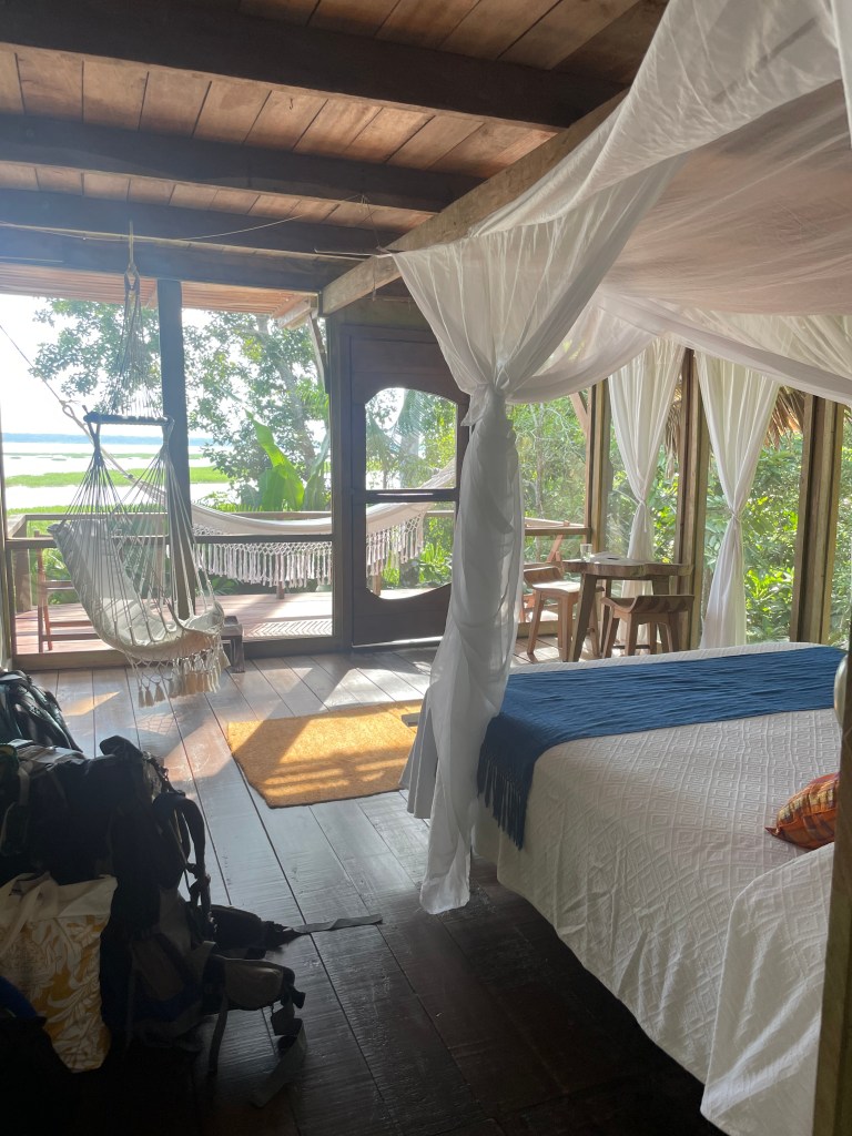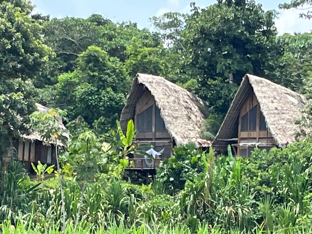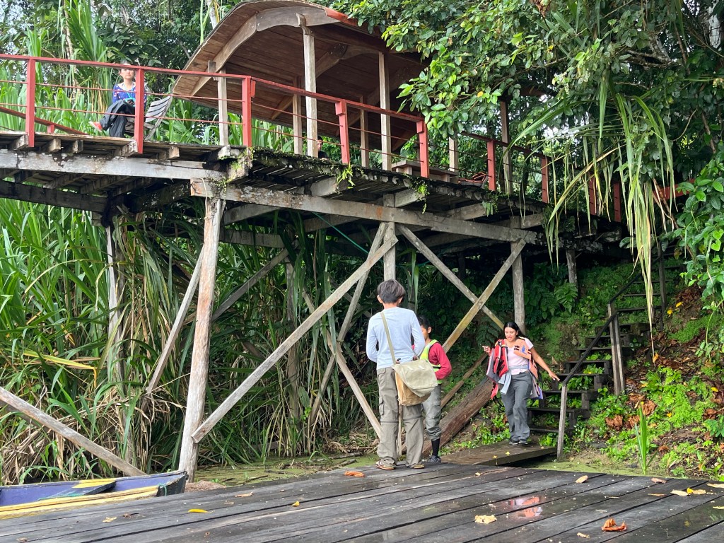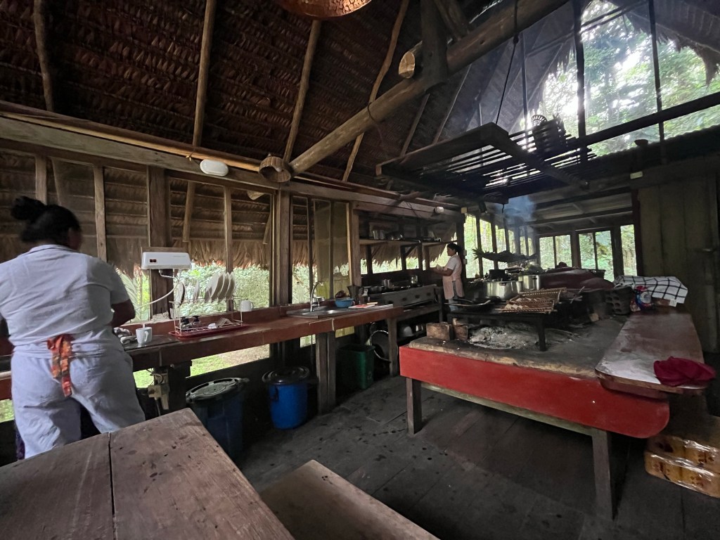 We’re participating in what’s known as an “eco-tour.” The lodge or camp is made from local materials and can be pretty minimal. The day trips consist of experiencing anything in the area-local villages, foliage and animal spotting etc. The Calanoa lodge is already built on higher up ground so the buildings aren’t on stilts to avoid the rising waterline during rainy season. This is known as a “high land” area. There are wooden walkways connecting all areas from the kitchen to the open dining area to each of the guest rooms. They make getting around easy and you feel separated from the many ground creatures.