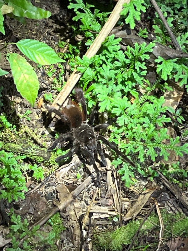 Our native guide George of the jungle tickled this guy out of its hole like a tako fisherman. This is a tarantula; they bite, are quite fuzzy and will irritate the skin when poked by its quills.