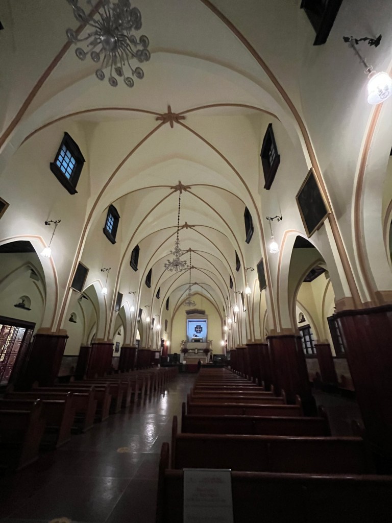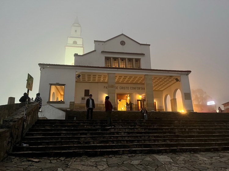 At the highest hill overlooking Bogota sits The Sanctuary of Monserrate, a church perched atop a mountain. You can hike up, take a cable care or a funicular. We went up for the night views