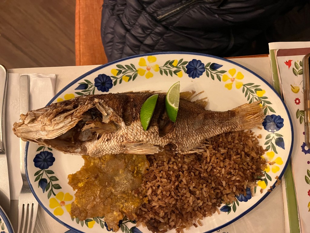 and eating at Casa Santa Clara, a French/Colombian restaurant.