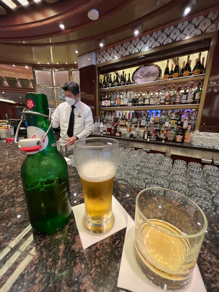 We Ubered back down to town to make our 530 all aboard time. I tried to order a drink for myself and a mocktail for Hud at the stateroom using the app but it was a failure. I went to my trusty spiritual advisors-Christian and Dhan at Bellini’s.